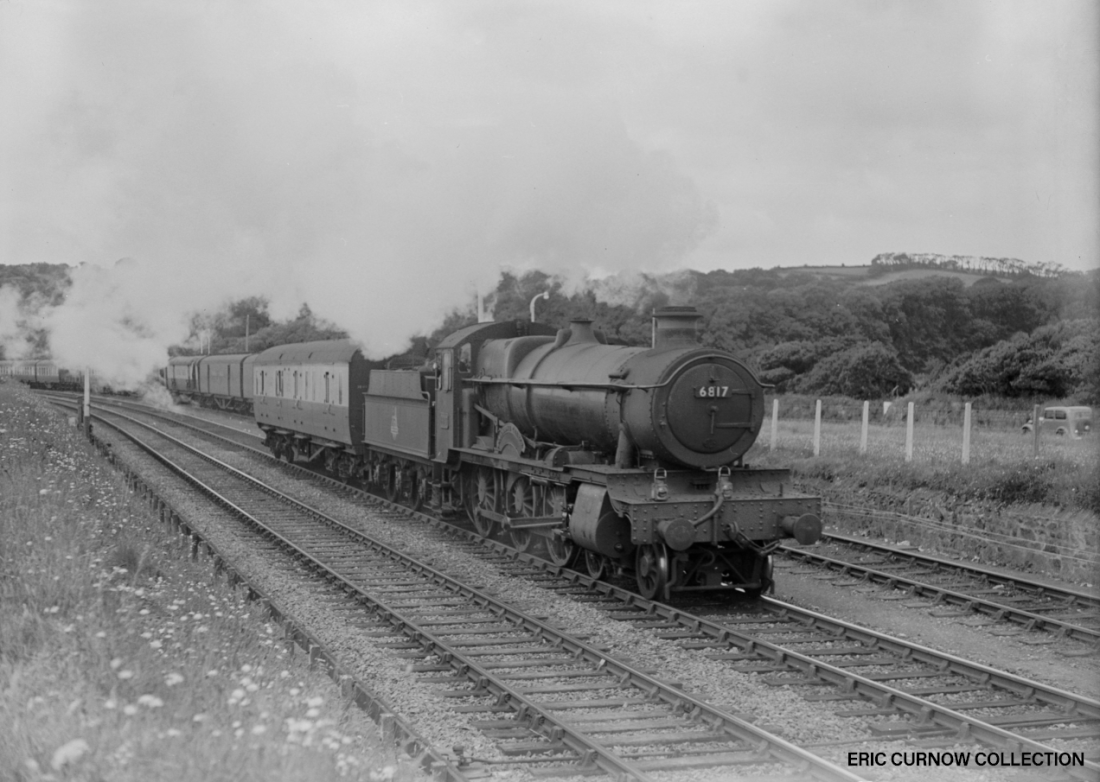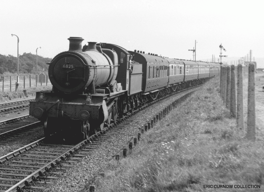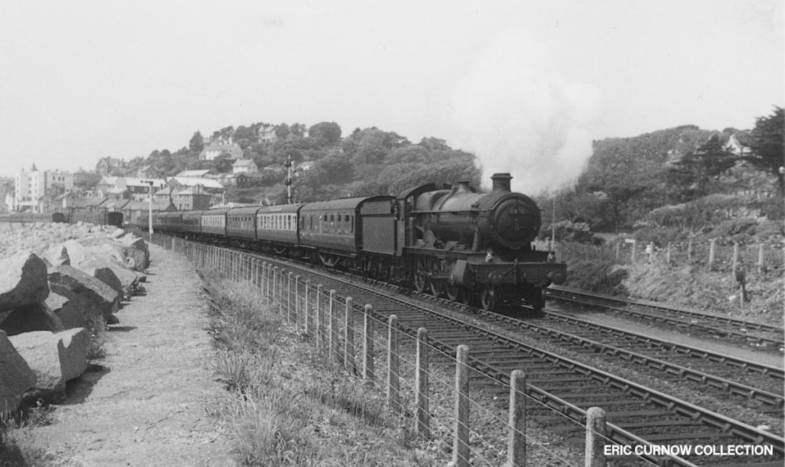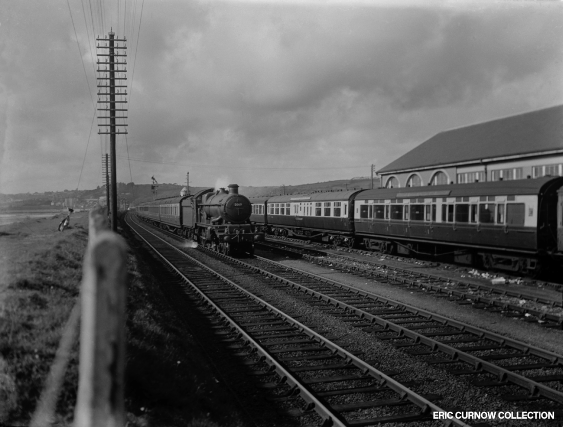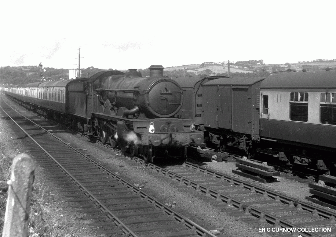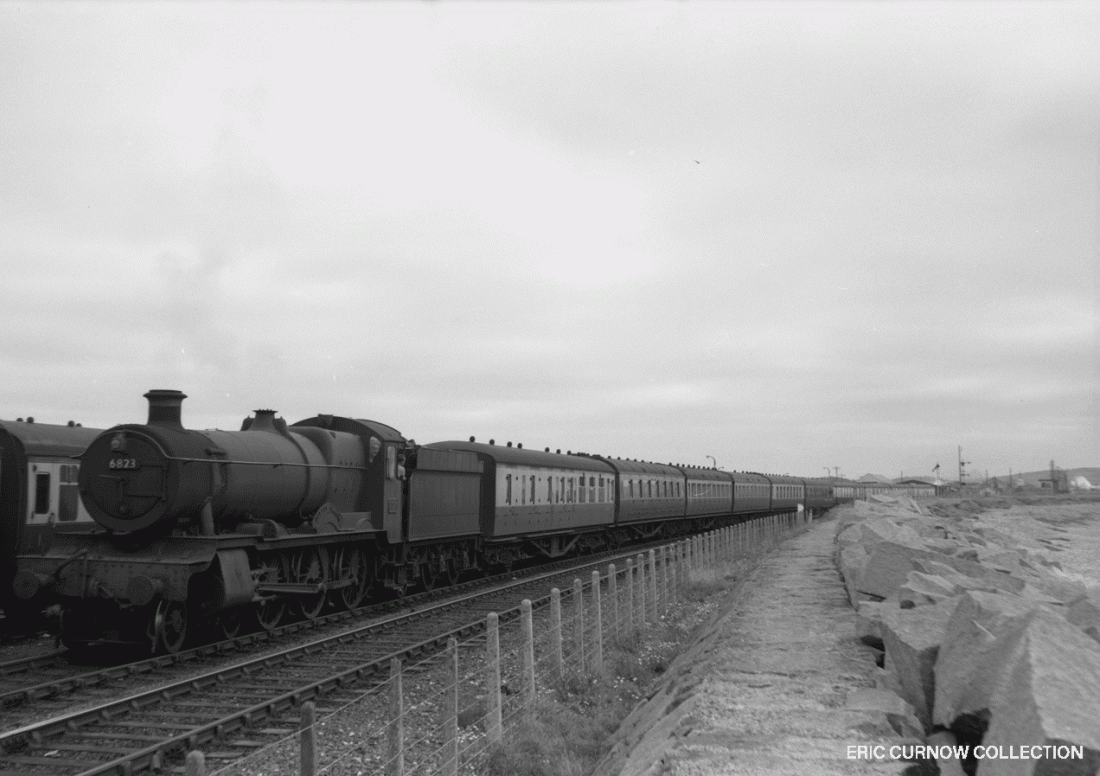 6921 “BORWICK HALL” hauls the noon train to Glasgow Central eastwards over Trevarrack Stream at Ponsandane in 1959. To the left of the line side fencing is the raised walkway and rock armour – just beside the photographer was one of two granite blocks dislodged by the sea and annoyingly part blocking the path, that resisted all my puny efforts to put back in place(!) 59####B01-PDN-s6921-PAS_U