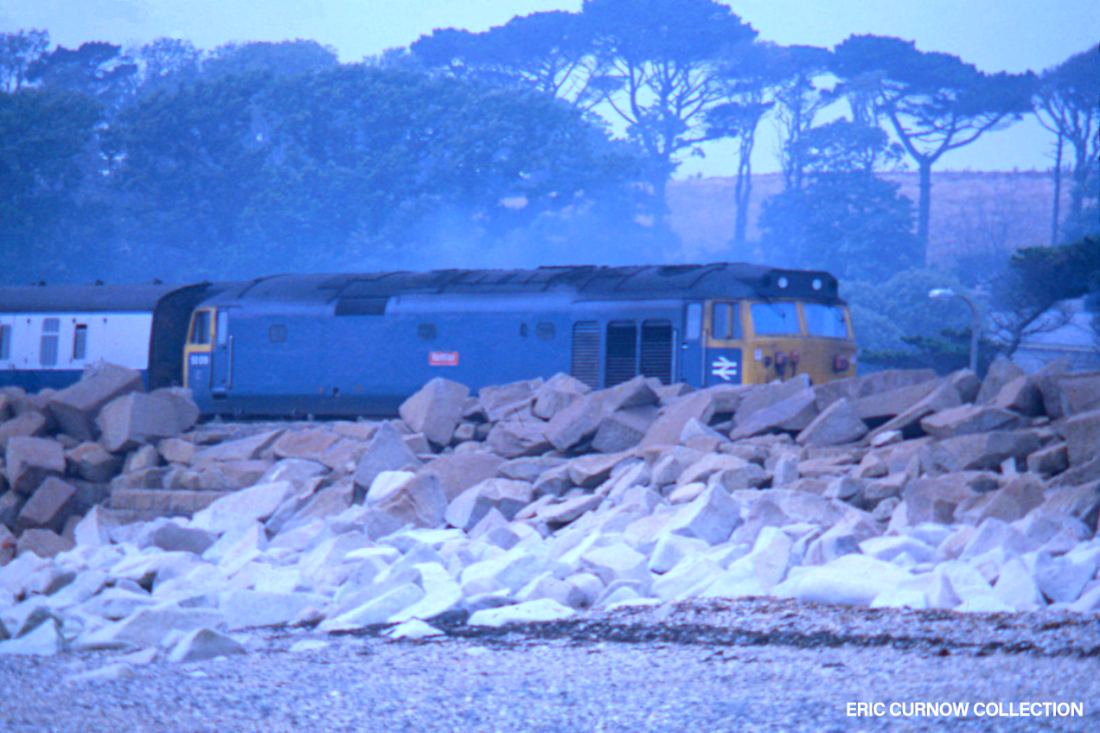 Whenever a loco passed along Eastern Green, it was always something to stare at before resuming a walk across the foreshore. A rather smoky 50019 “Ramillies” runs an up service across the bridge over Trevarrack Stream with the beautiful Scots Pines still behind. The whiter granite blocks seem a later addition, but there was no distinct demarcation, that frequently puzzled me. 7####HR01-PDN-50019-PAS_U