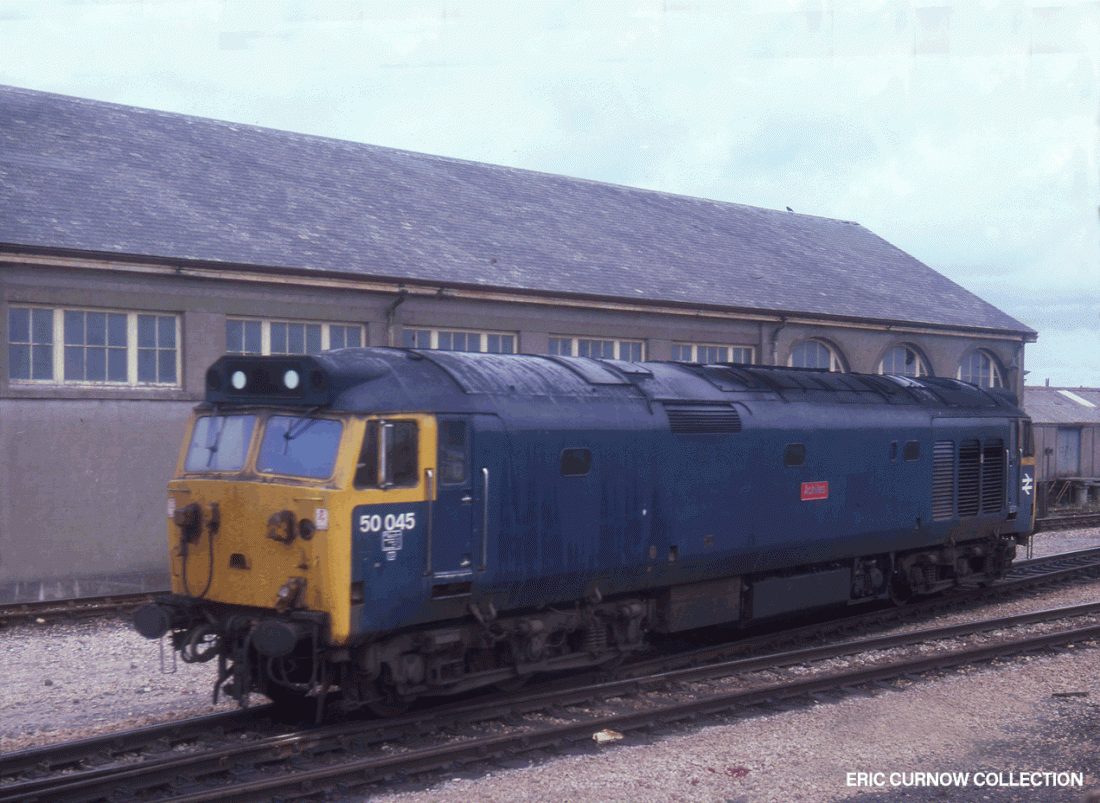 A few years since arriving in works condition to herald the arrival of the class on Long Rock Depot, 50045 – still an impressive sight, and now with “Achilles” nameplates – moves off the bi-directional track before Ponsandane Goods Shed towards Penzance. 7809#####-PDN-50045-LIGHT
