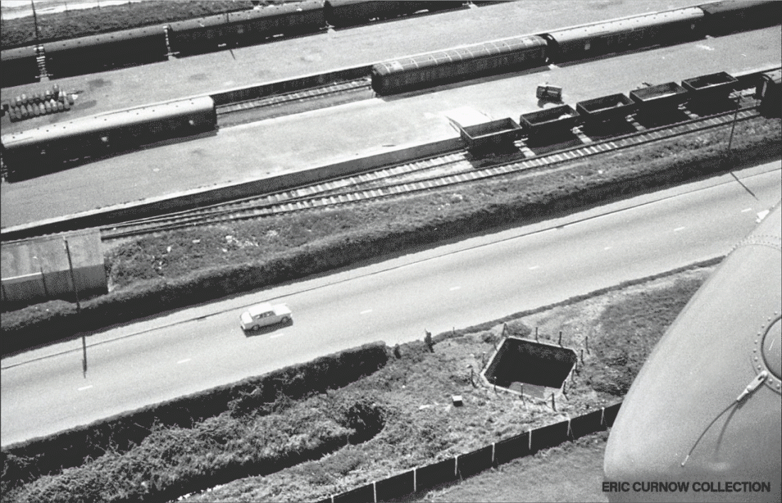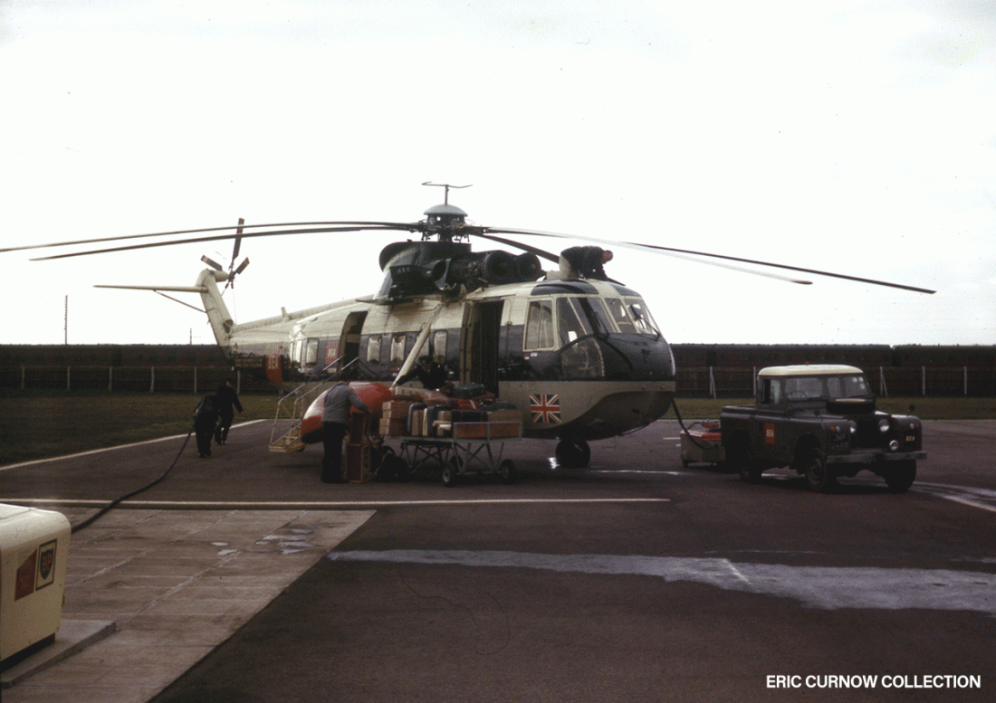 Boarders are ushered towards their flight at Penzance Heliport in 1966. In the background is Ponsandane Yard where a Class 08 shunter is parked before the Shunter’s Mess, next to stock-filled sidings. The pitched roof building nearby is a store. 660507A01-PDN-HCPTR-PARKD