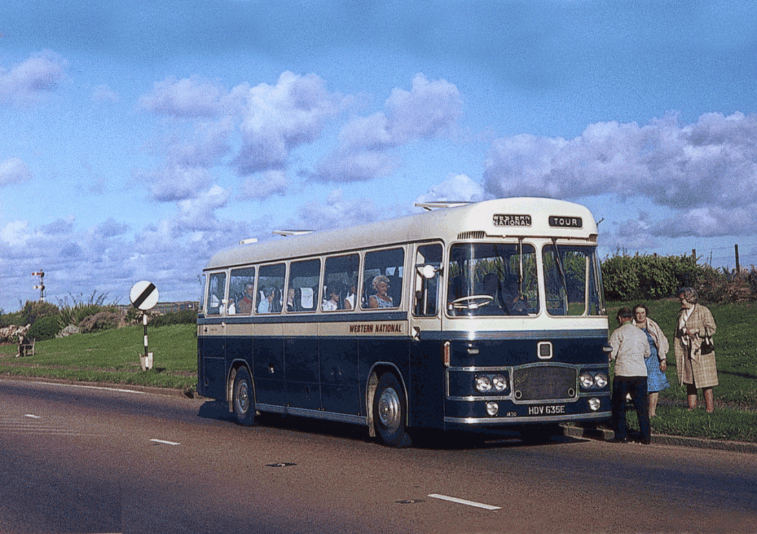 The other side of the wall shows a 1970s view of the earthwork built up to the wall, and bushes planted to make the outlook more pleasant. A Royal Blue tour bus drops off passengers in the cool of the evening as puffy Cumulus clouds crowd the sky. 70###AB01-PDN-COACH-PARKD