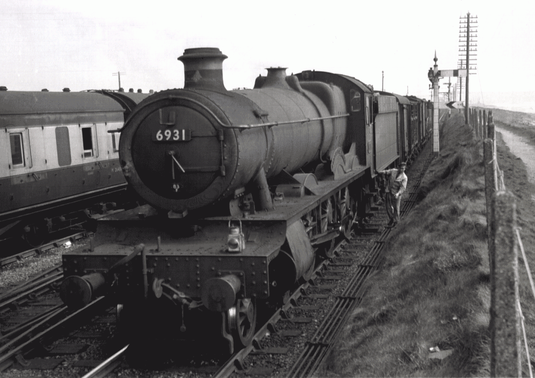 The fireman of 6931 “ALBEBOROUGH HALL” stands on points rodding, peering towards Ponsandane Box as his local parcels service is halted on the down main. The loco has a Truro shed plate on its front end, and is hauling a real mixture of stock, including a broccoli wagon. Copyright: Stan Brown/Keith Jones. 5####CE01-PON-s6931-GDS_D