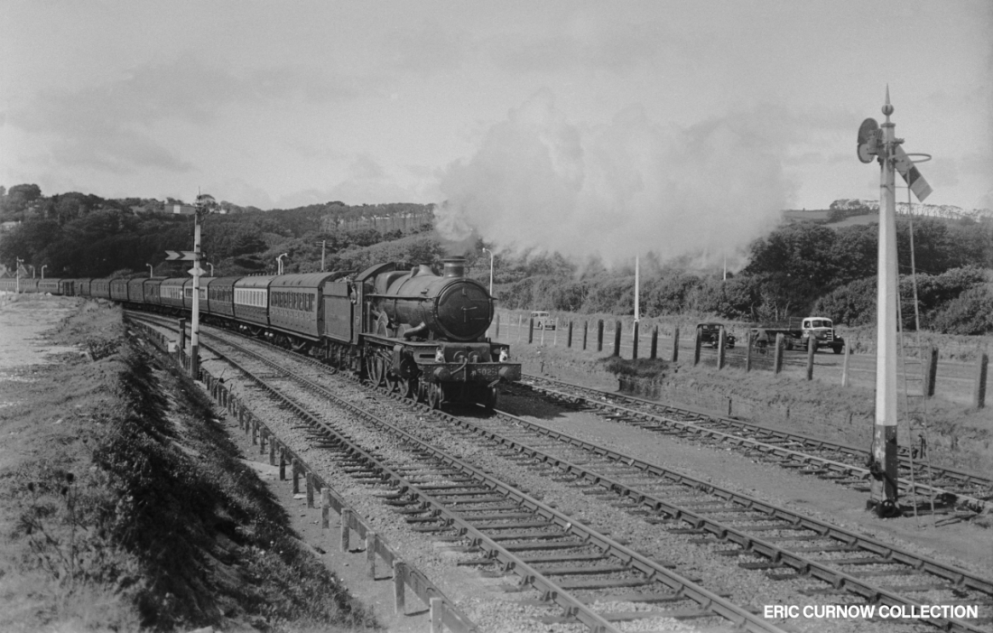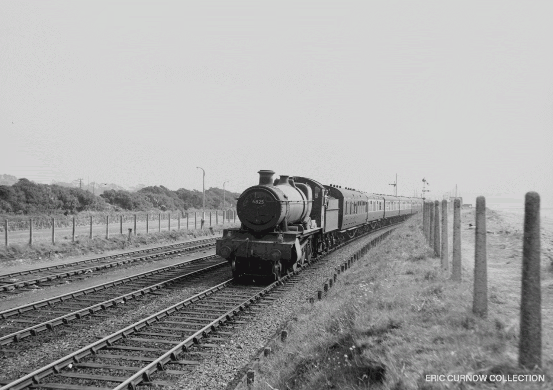 In the 1930s, 5026 “CRICCIETH CASTLE” approaches Ponsandane Crossing with a long mixed stock train, its exhaust creating a shadow that stretches across the A30 road beside it where several eastbound vehicles are apparently keeping pace. On the other side of the tracks, the scooped out sand dunes of the lineside have yet to receive concrete boundary posts and wiring. 3#####A01-PDN-s5026-MIX-U