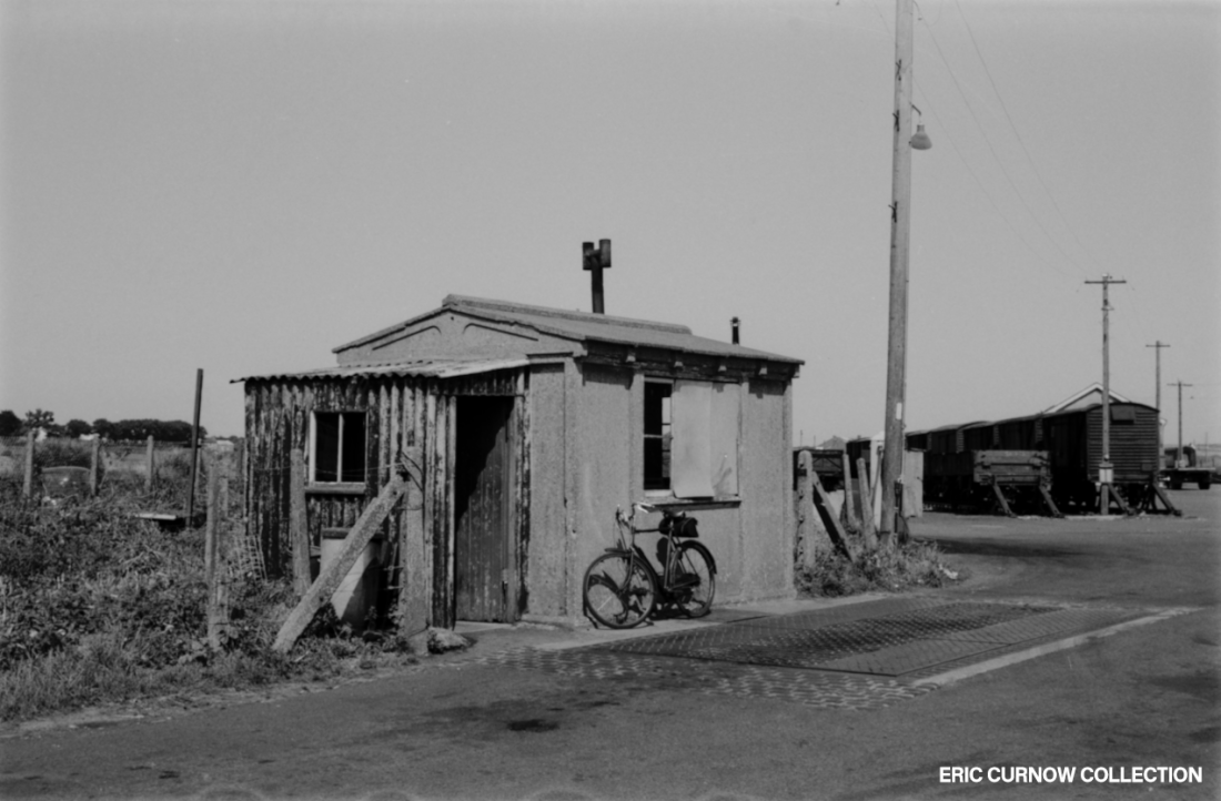 The weighbridge in Ponsandane Yard in the 1960s much as I remember it. The basic concrete panelled building has had a corrugated iron porch added and a stove has understandably been fitted at this fairly isolated and exposed location. To the left is a chain link fence and undergrowth, with St Theresa’s and the wood nearby it, and to the right, vans and the ridge of the Goods Shed. 6####JA01-PDN-WEIGH-VI_SE