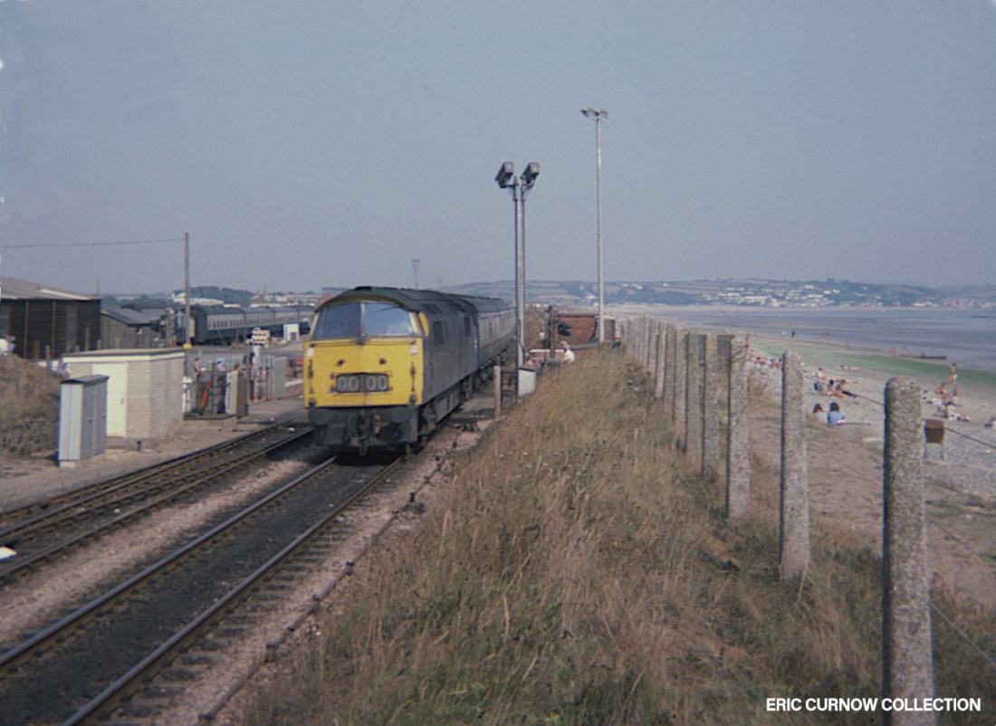 Holiday-makers enjoy the sun on the beach at Ponsandane and wait either side of the automated crossing as D1001 “WESTERN PATHFINDER” passes with a down passenger train on 14th August 1976. Its headcode has been wound to zeros, and someone leans from the carriage to take in the remarkable view – now sadly marred by high sea defences. 76###AK01-PNZ-D1001-PAS_D