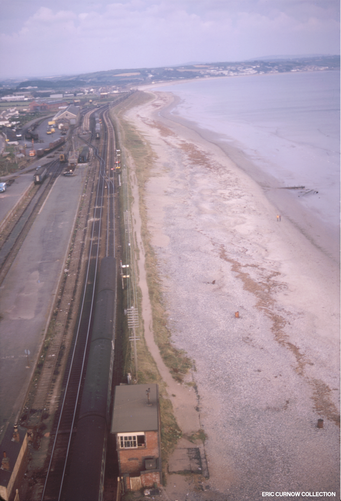 A wealth of detail in this picture from the Scilly helicopter, showing the seashore between Ponsandane Signal Box (bottom right) and Long Rock in October 1972, before rationalisation changed much substantially. The sand dune tracks along the lineside are still lined with semaphores; the double track is in situ, and the Goods Shed and old Steam Shed are still in use. 7210##A01-PDN-COAST-VI_NE