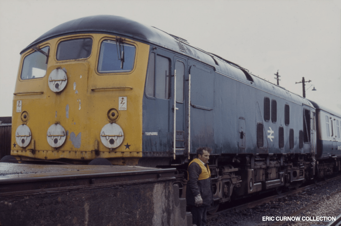 With very presentable blue bodyside paintwork, but scuffs and scrapes on the former connecting door area at the front of the locomotive, TDB968008 (ex-24054) is pressed hard against the buffers for steam-heating purposes, even though in this position it couldn’t serve many carriages, as the rake would foul the connection line into the yard that was still in use at that time. 770317A01-PDN-TDB24-PARKD