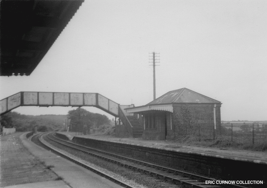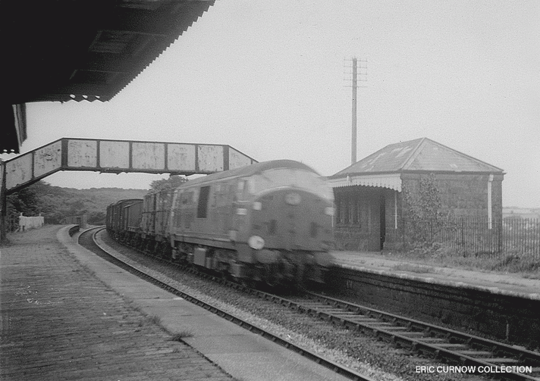 D6320 rushes through Scorrier Station, below a footbridge that is flaking paint, with a mixed goods train of ‘Door to Door’ containers and assorted vans. There is a noticeable difference between the ballast under each line, neatly laid at different times. 650811A02-SCO-D6320-GDS_U