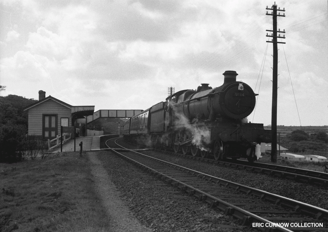 Steam feathers towards the driver from the cylinders of 5934 “KNELLER HALL” as it leaves Scorrier eastwards with a passenger service. At this end of the smartly finished station building are double doors for loading straight onto a vehicle. 59###AC01-SCO-s5934-PAS_U