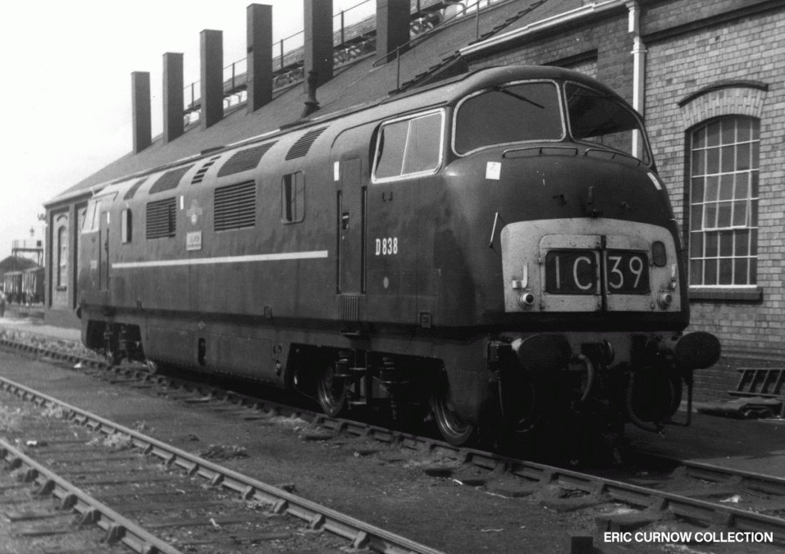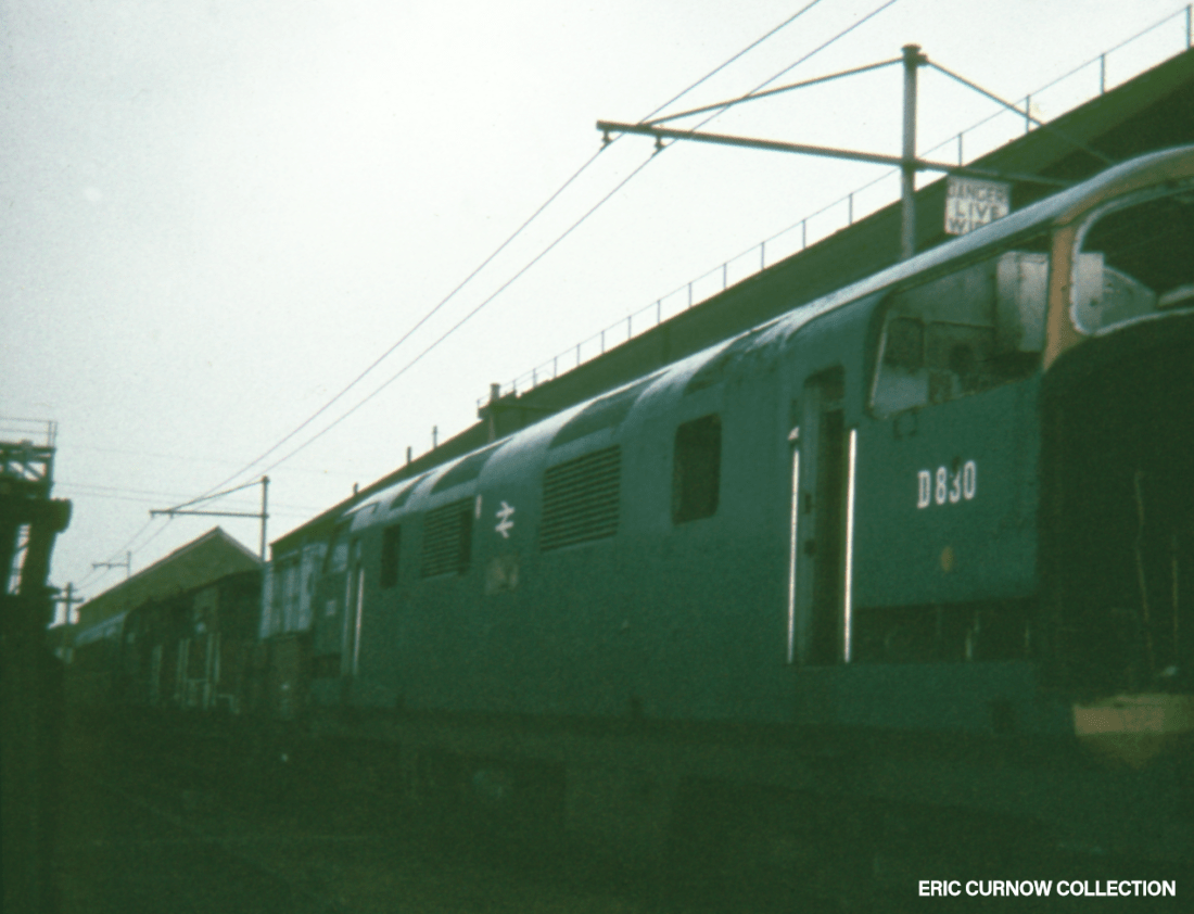 D866 ‘ZEBRA’ stands broadside to the camera, displaying overhead wires panels, the new rail alphabet numbering but with ‘D’ prefix retained, double logos and RA panel, but an old style shedcode. This was a BR promotional shot of 1968. 6809#AB01-SWW–D866-PARKD