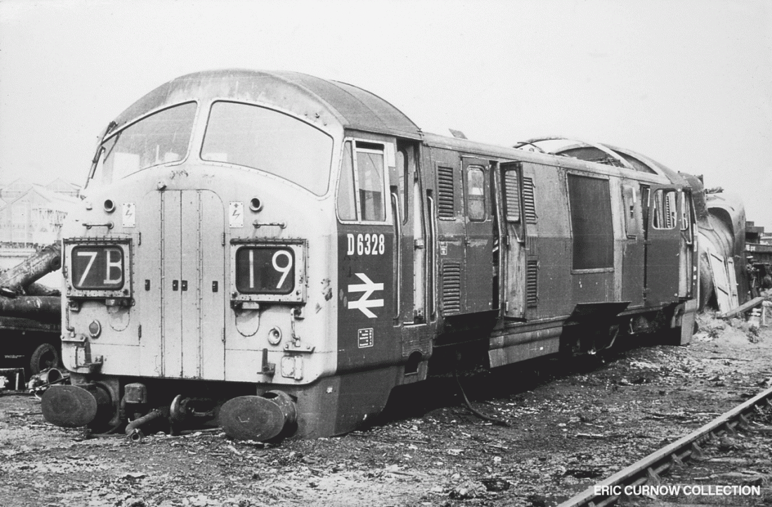 Bereft of its bogies and key components cannibalised for reuse, the shell of D6328 awaits its complete disposal at Swindon Works, In the background to the right – surprisingly, so long after eradication – is a steam engine boiler of similar fate. Photo: Norman Preedy. 7205#ED01-UNK-D6328-SCRAP