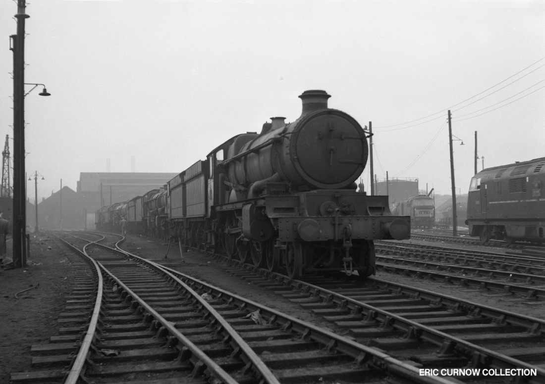 A string of Castle Class steam locos with name and numberplates removed are stored at Swindon on a misty morning, with D818 “GLORY” and a Hymek diesel nearby. In the background are workshops, running sheds, fuel tanks, crane and a water column. 6####CM01-SWW-STEAM-SCRAP