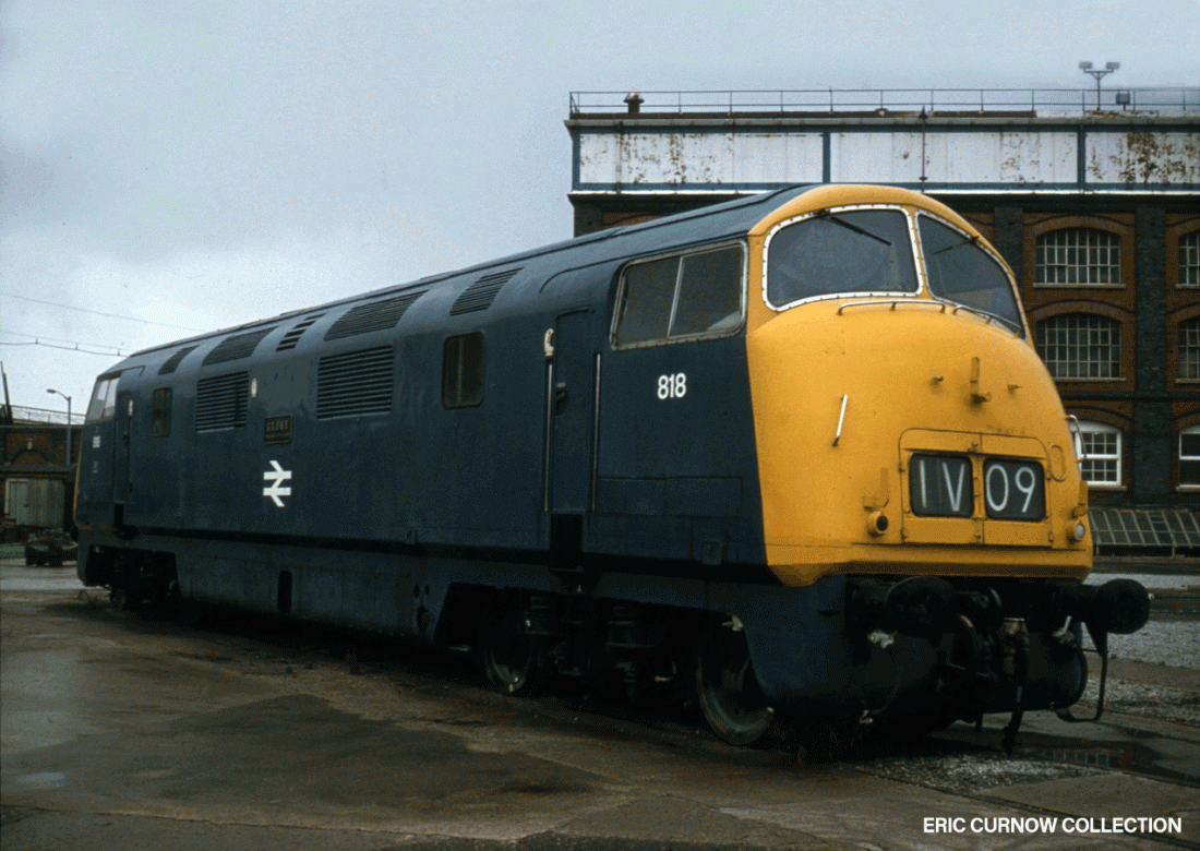 818 “GLORY” is on display at Swindon Works, superficially complete, but internally missing vital components. Behind it is one of the Work’s buildings with water tank on top. Lasting years beyond its class mates, the loco sadly did not make preservation. 7####BH01-SWW–d818-PARKD