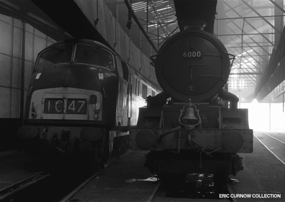 Sunlight floods Swindon running shed with light, casting 6000 “KING GEORGE V” and a ‘Warship’ diesel into semi shadow in the depths of the shed. Exhaust shields still hang from the roof structure and the brick floor has a few puddles at the front end. 6####AQ01-SWW-LOCOS-PARKD