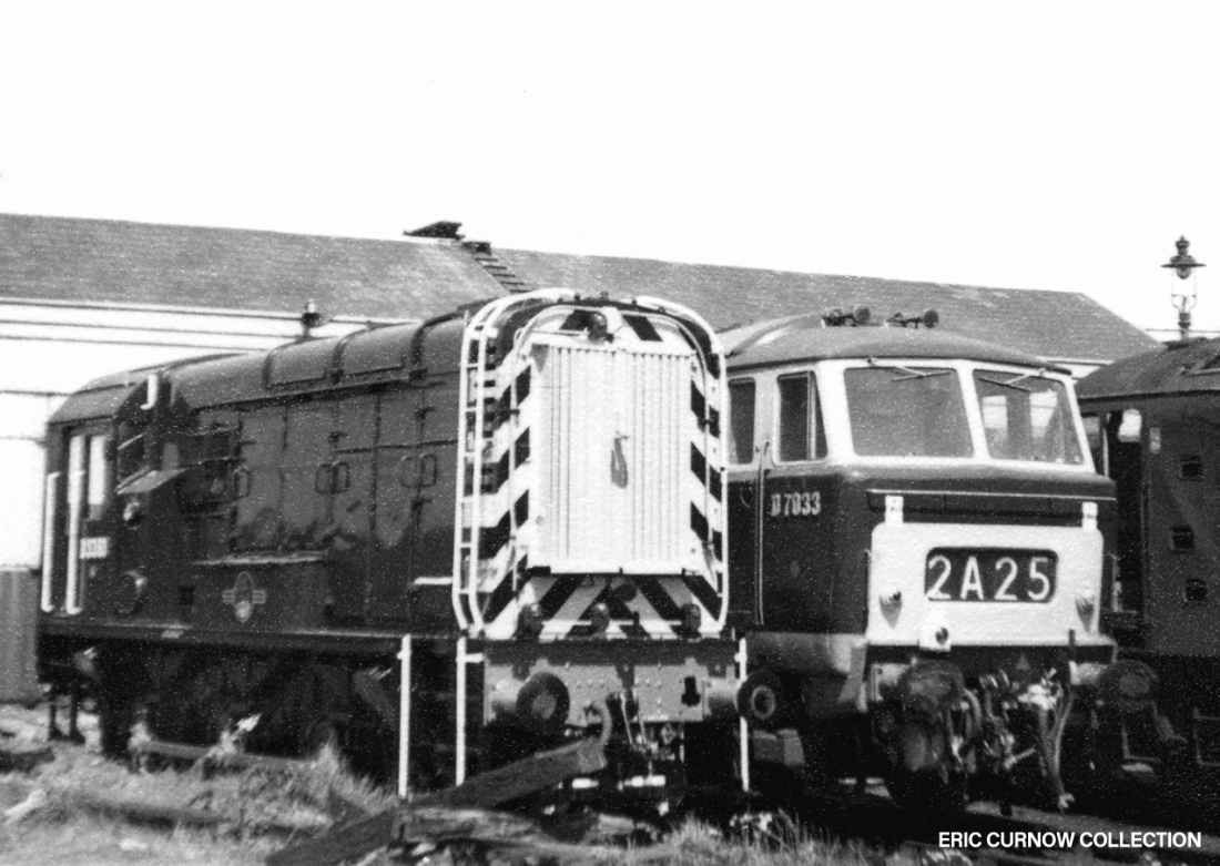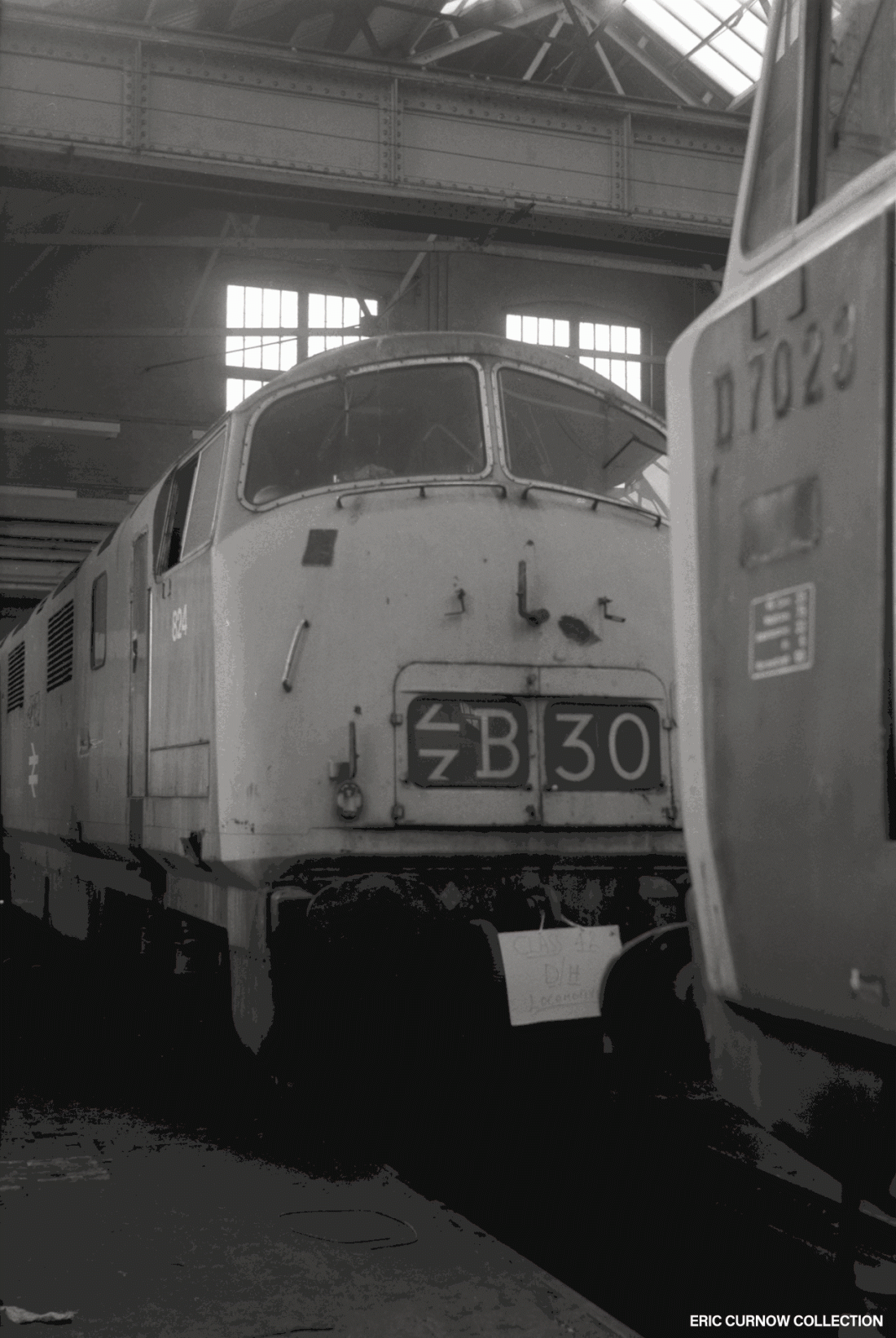 824 and D7023, bereft of name or number and builder’s plates lie in a quiet corner of Swindon Works. The ‘Warship’ has a sign hanging from its coupling hook reading, ‘CLASS 42 D/H LOCOMOTIVE’, suggesting this is after some sort of public visit. On its buffer beam it still displays the double diamond symbols denoting multiple working. 740907A01-SWW-D_LCO-MNTCE