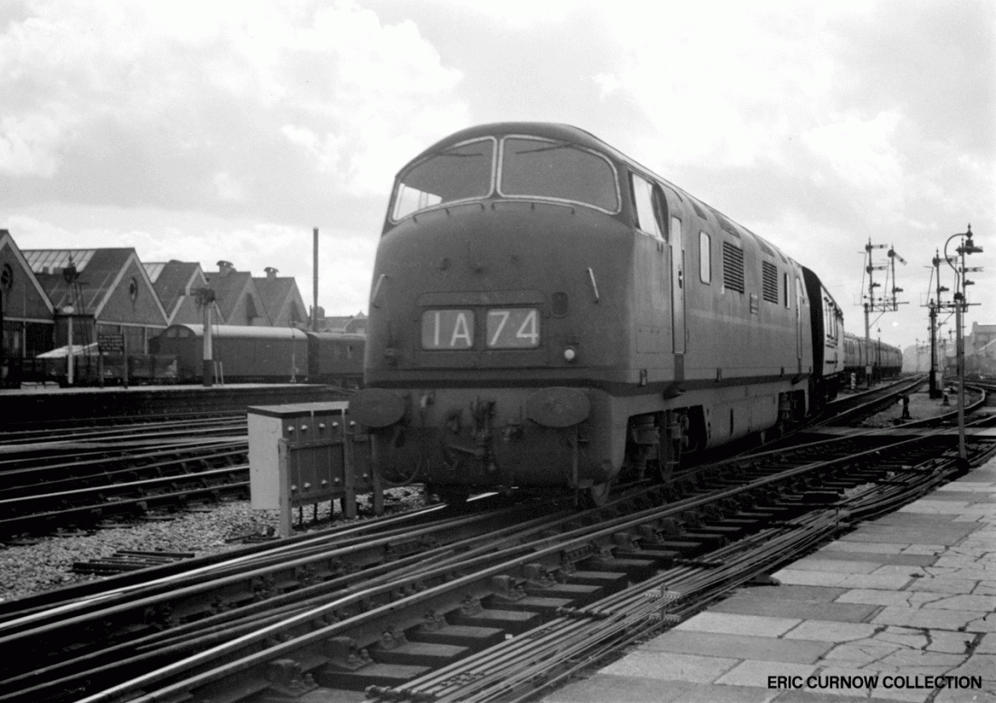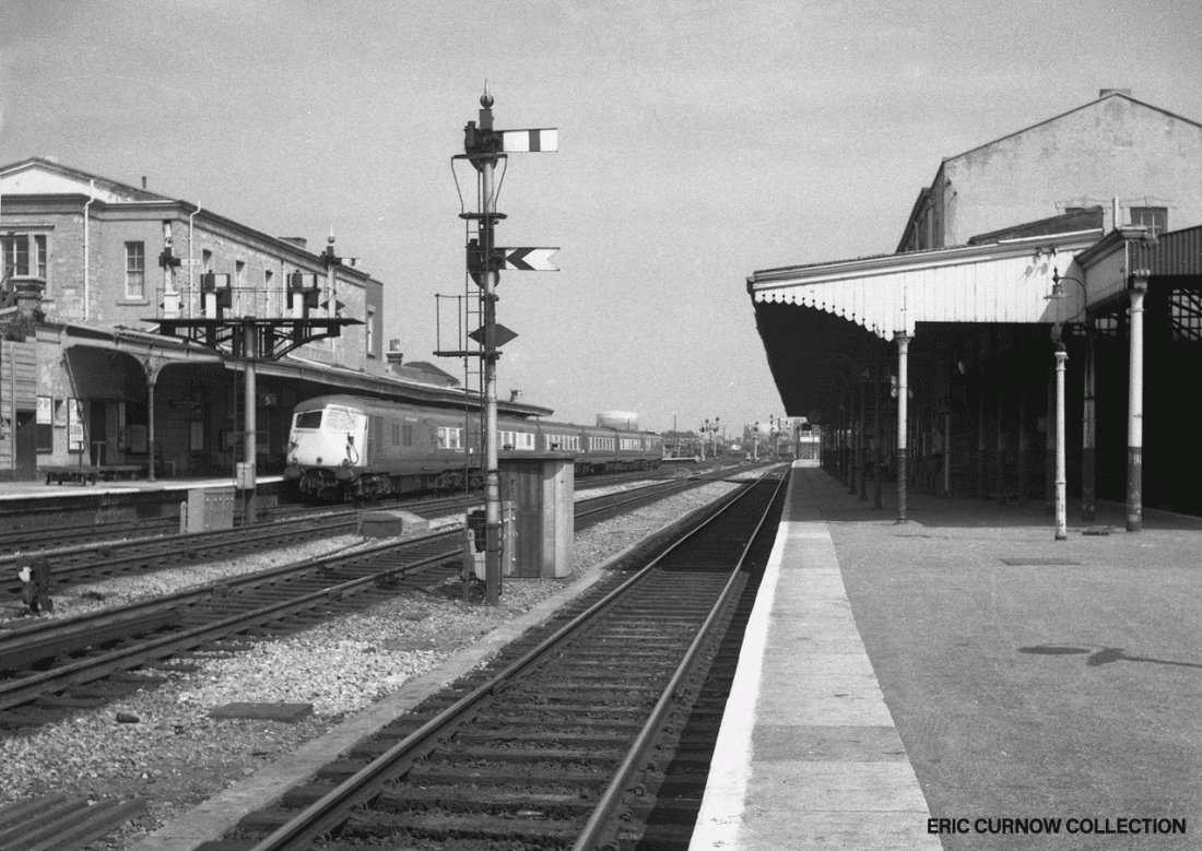 D811 “DARING” with steam-era headcode boards on its front end races through Swindon with a non-stopping passenger train of chocolate and cream coaches in 1963. Behind it the station building appears to have been extended with a lighter brick portion, and before it, the base of a water crane suggests recent removal of that fixture no longer required in the diesel age. 63###AJ01-SWI–D811-PAS_D