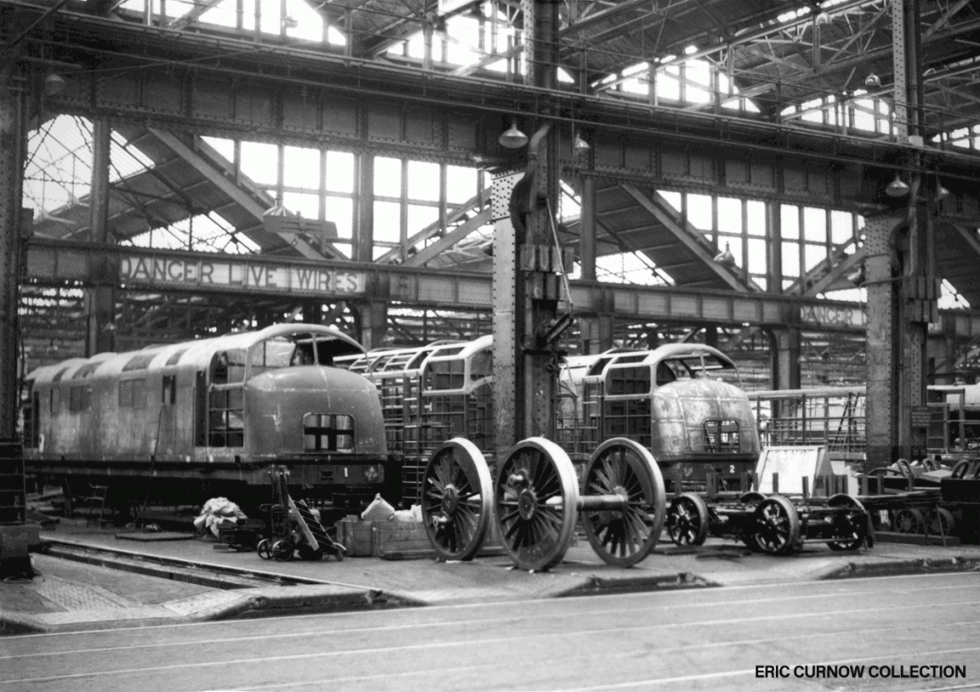 The ‘new work’ area in Swindon Works ‘A’ Shop where ‘Warship” Class locomotives are being built. D803 “ALBION” is believed to be the loco carrying ‘1’ on its buffer beam, and D804 “AVENGER” ‘2’ – the others may be D805 “BENBOW” and so on. 59###AE01-SWW-LOCOS-BUILT