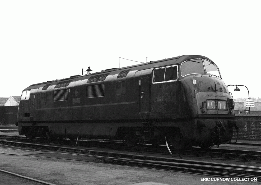 D855 ‘TRIUMPH’ is parked near the Dean Street exit from the Swindon Works complex on a damp day in March 1966. It still wears presentable, but work worn, original livery with red nameplate background and white bodyside stripe. 660306A01-SWW–D855-PARKD