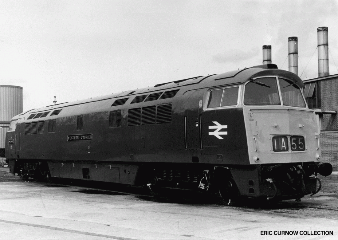 Looking resplendent in corporate livery, D1062 “WESTERN COURIER” is parked up in the display area by the turntable on the mainline side of Swindon Works. Its four battery box latches are all neatly aligned in yellow paint, matching the warning panel at the front of the machine. 750913A01-SWW-D10##-PAS_D