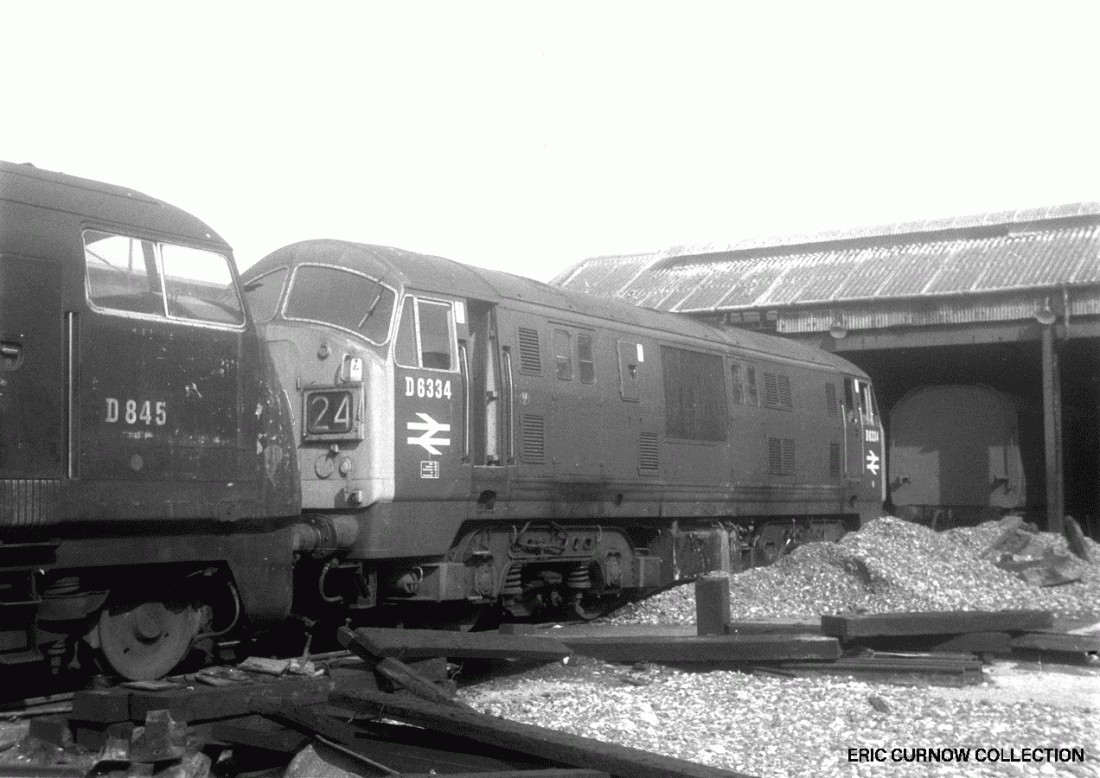 D6334 and D845 “SPRIGHTLY” are parked up at Swindon – the Warship still in green livery, but weather-beaten, and D6334 in serif numeral blue. Piles of ballast and sleepers lie around; with the rusty stained corrugated roof and shed lintels they give a semi-derelict appearance. 690824A01-NTA-D6334-PARKD