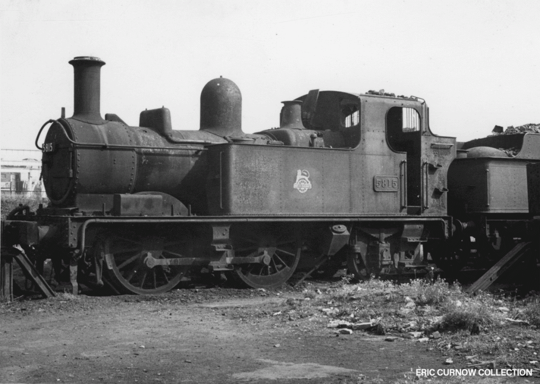 Looking as if it hasn’t turned a wheel for some time, ex-GWR 0-4-2 5815 is out of service at Swindon, boxed in against the stop blocks by a tender loco. Its paintwork is blistered from the sun and it displays a “cycling lion’ emblem over a painted patch. 5####BM01-SWW-s5815-SCRAP