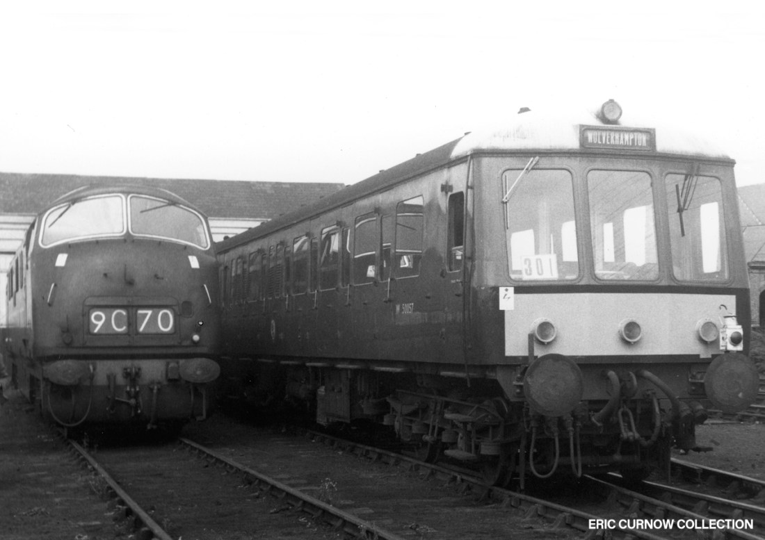‘Warship’ Class D825 “INTREPID” is parked next to W50057 at Swindon. The loco has yet to receive yellow ends, and although the unit has a band, the experimental white above the windscreens is already fading and will not be retouched but painted out. 620812A01-SWI–D825-PARKD