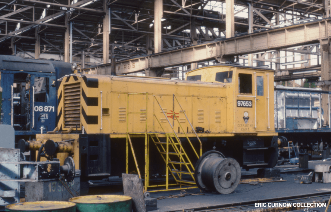 Ruston & Hornsby Permanent Way Machine 97653 is in Swindon Works for attention in April 1983. This loco was based at Taunton and Reading for long periods of its life, and has a dark panel behind the lettering as, being white, the numerals wouldn’t show up on the yellow livery. The writing below the RH loco says, “CCE PLANT No. 83635”, and 08871 is in the background. 8304##A01-SWW-97653-REPAR