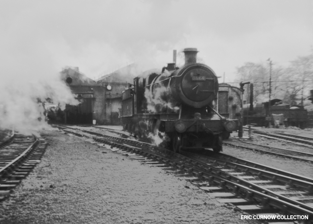 Clouds of steam mingle with atmospheric clouds as huge 2-8-0 3864 creaks across the pointwork before the shed at Westbury depot on 14th April 1965. Similar to Penzance depot, it however had a clock on the building’s facade, and a line of trees beside it rather than pump house and boiler house, To its right is a breakdown van, a water column, horizontal piping, and another loco. 650414A01-WBY-s3864-LIG_D