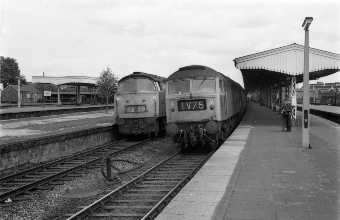 47230 draws into Taunton Station on 20th July 1974 alongside D1025 “WESTERN GUARDSMAN” heading the 1B39 10.56 Paddington-Penzance. Spotters stand together on the down platform, switching their attention away from the Brush to new interests, and young scrawny trees have been planted on the island platform to avoid the monotony of the now bare surface. 740720A01-TAU-LOCOS-PAS_D