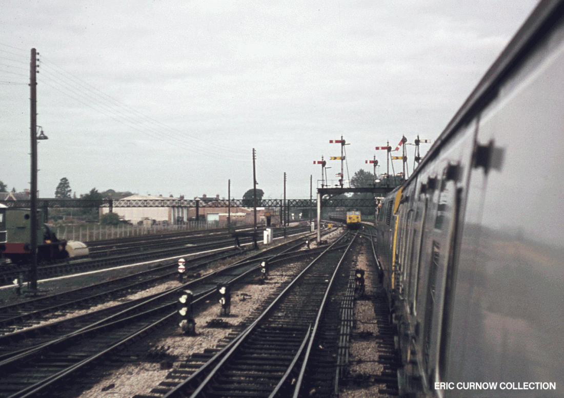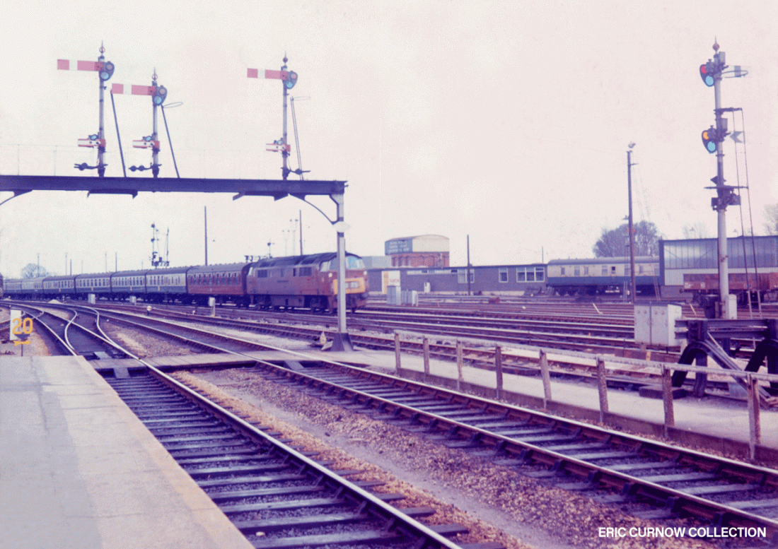 The western approach to Taunton Station, where a Class 50 on an up passenger service heads into the station as the driver of a ‘Western’ looks back before pulling off. The long pedestrian bridge is in view, as is stock destined for the West Somerset Railway at left. 740914A01-TAU-SGNLS-VI__E