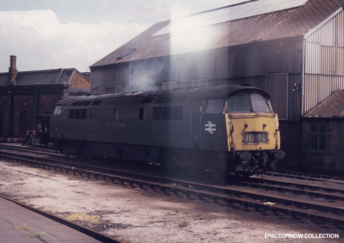 D1054 “WESTERN GOVERNOR” is parked next to the stabling point building, across from the west end of Taunton Station’s “down” platform. The asbestos panels of the walls and window coverings above brickwork are replicated in the buildings on either side. 7####EC01-TAU-D10##-PARKD
