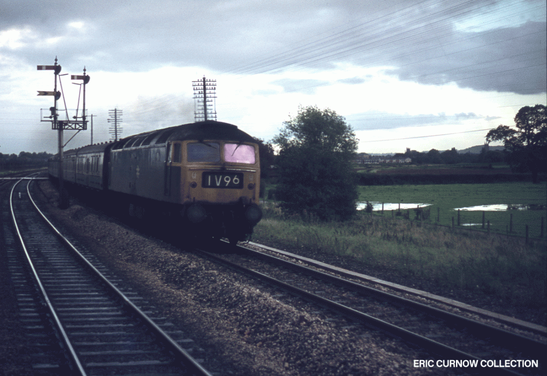 At Norton Fitzwarren, a Class 47 heads westwards in the evening gloom with a passenger service. Semaphores and telegraph wires are still dominant, and the loco displays the headcode for an inter-regional working as it races along. 7####EL01-TAU-47###-PAS_D