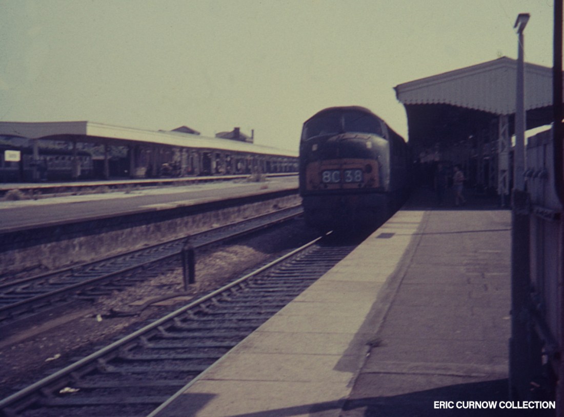In strong sunshine casting deep shadows and masking young trainspotters, D812 ‘THE ROYAL NAVAL RESERVE’ arrives with a down service at Taunton. Even in “green and yellow” days, the central platform has already been denuded of station furniture and weeds grow in clumps. In the bay platform opposite waits a Minehead shuttle DMU. 6####IH01-TAU–D812-PAS_D