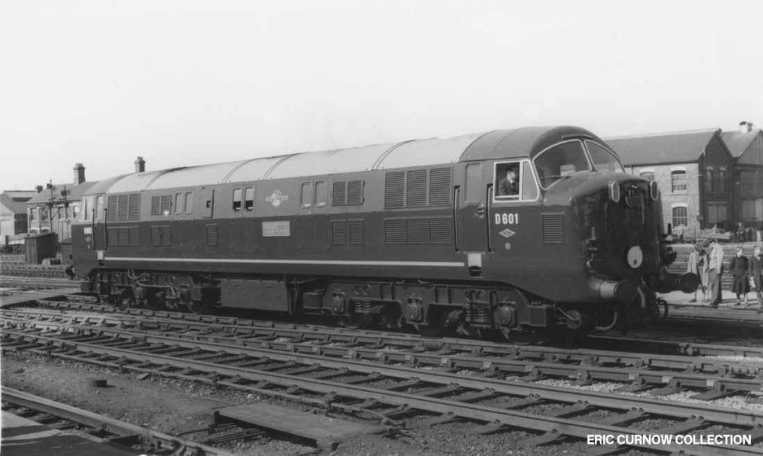 ‘Out of the box’ and with hardly an exhaust stain on its roofline, D601 “ARK ROYAL” – carrying the requisite single white disc ‘light engine’ headcode on its near end – waits prior to moving off; the second man staring resolutely ahead. Visitors stand ambivalently nearby, their proximity suggesting interest, but quite possibly prefering steam to diesel locomotion. 7####GY01-UNK–D601-PARKD