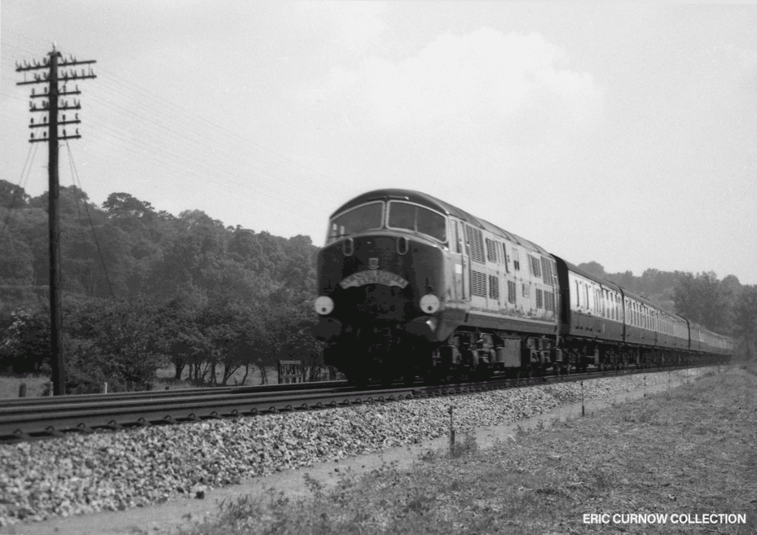 With the sheen of the varnish brightening its flanks and various edges glinting, one of the five new D6XX locos climbs the bank up from Totnes with the west-bound Cornish Riviera Express. A feature of the early days was the nose horn cover farings being picked out in grey. 5####AI01-UNK—D6##-PASGR