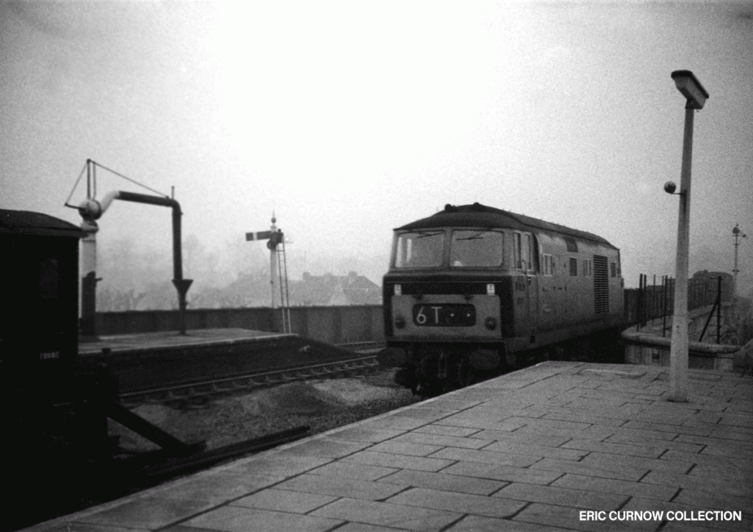 D7071 arrives off a bridge pulling a freight at a GW station with a steam age water column on one side and modernity on the other. The widely spaced platforms have a centre road that has been truncated with a stop block and has a van parked against it. 640208A01-UNK-D7071-LIGHT