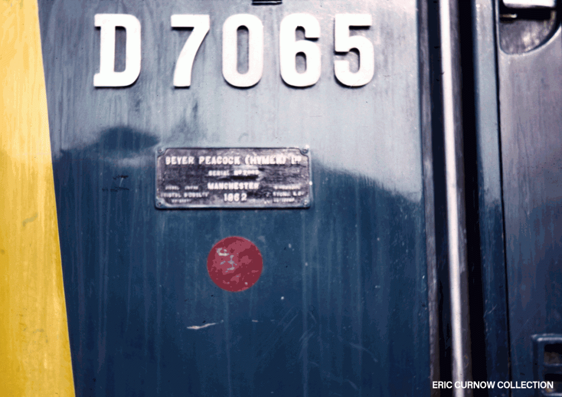 A colourful detail of Hymek loco D7065’s cabside, bearing separate digit aluminium relief lettering, the locos builders plate with black background, and red route restriction circle – crammed into a small space on a rail blue ground with yellow warning panel. 7####DU01-UNK-D7065-PARKD