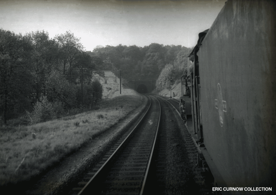 With a ‘green’ showing clearly ahead, the fireman of a passenger service stares ahead to the tunnel soon to envelop the train in a beautiful country area – the loco having smoke guards fitted to the side of its smokebox and the tender bearing a ‘lion and dartboard’ emblem. 6####CP01-UNK-SLOCO-PAS_R