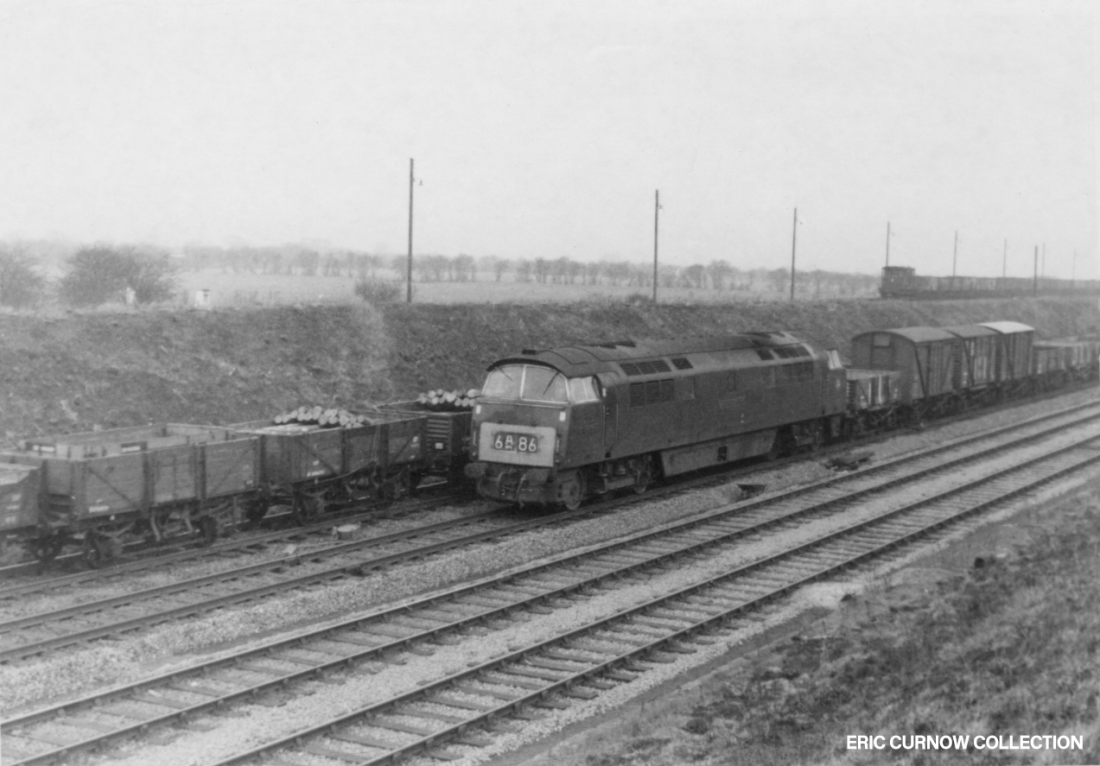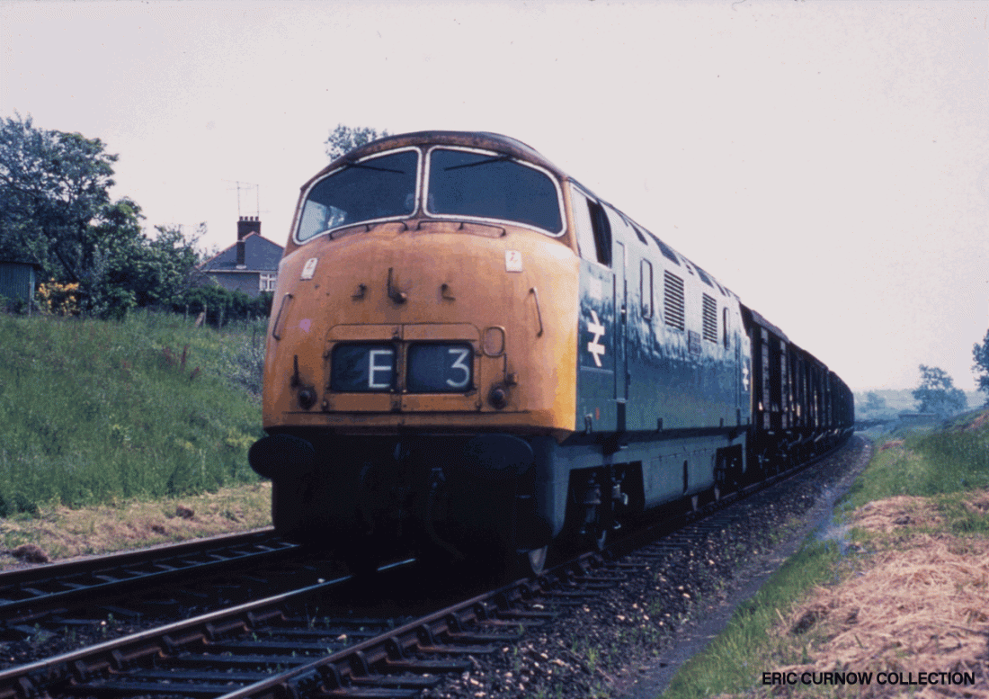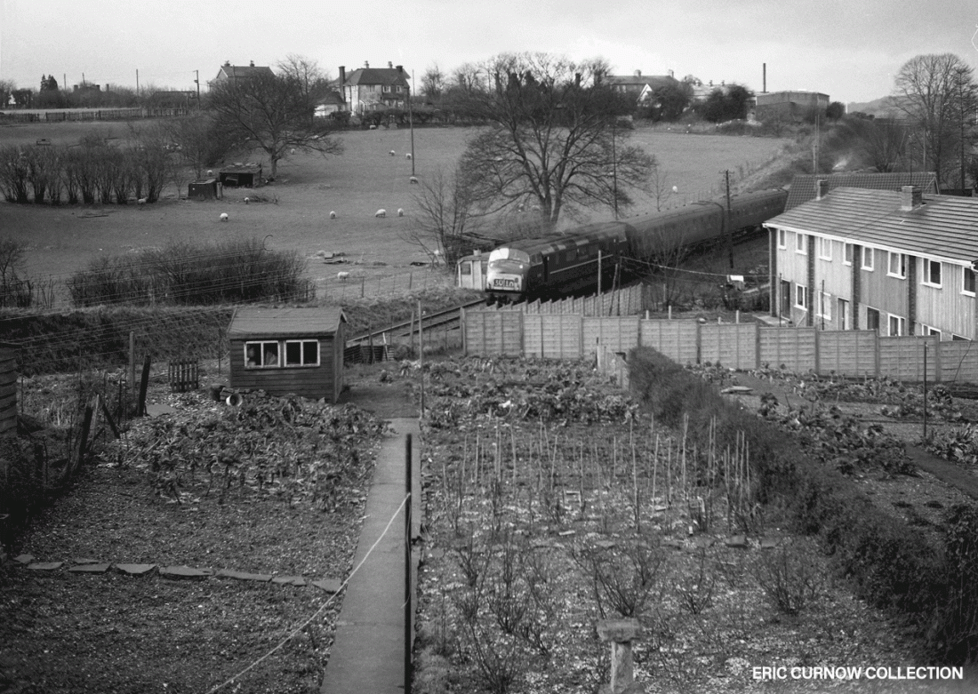 Passing through pastoral and town fringe countryside, D800 “SIR BRIAN ROBERTSON” is seen on the 07:40 Eastleigh to Waterloo, diverted via the Alton-Winchester line, near Alton. Sir Brian was Chairman of the British Transport Commission until Dr Beeching. 660227A01-ALT—D800-PAS_U