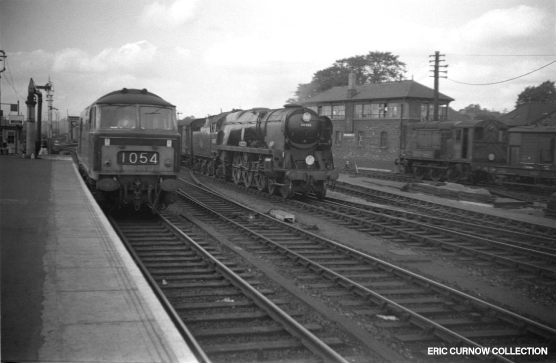 The west end of Salisbury Station sees ex-Southern Railway West Country Class 34089 ‘602 SQUADRON” arriving with disc headcode announcing a Plymouth / Waterloo or Nine Elms goods service in 1964. To the left is a green liveried Hymek and right an 08 shunter, shunting the WR yard before the signal box. The loco shed is in the distant right background. 64###AO01-SAL-34089-PAS-U