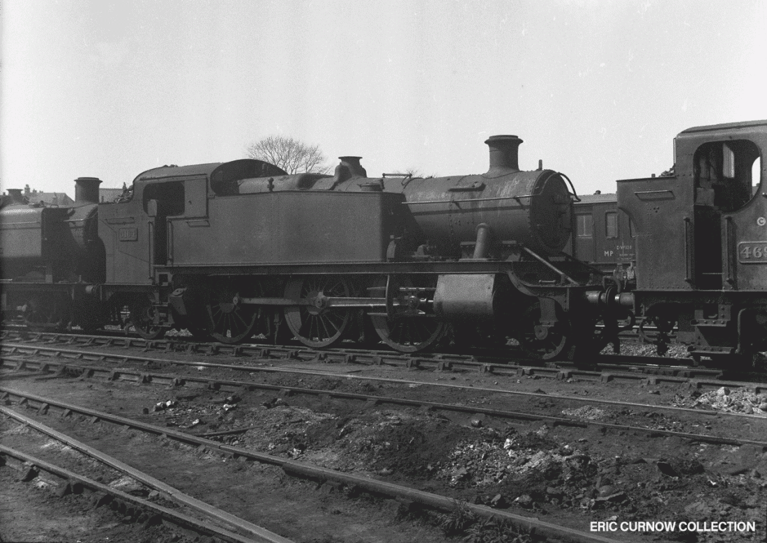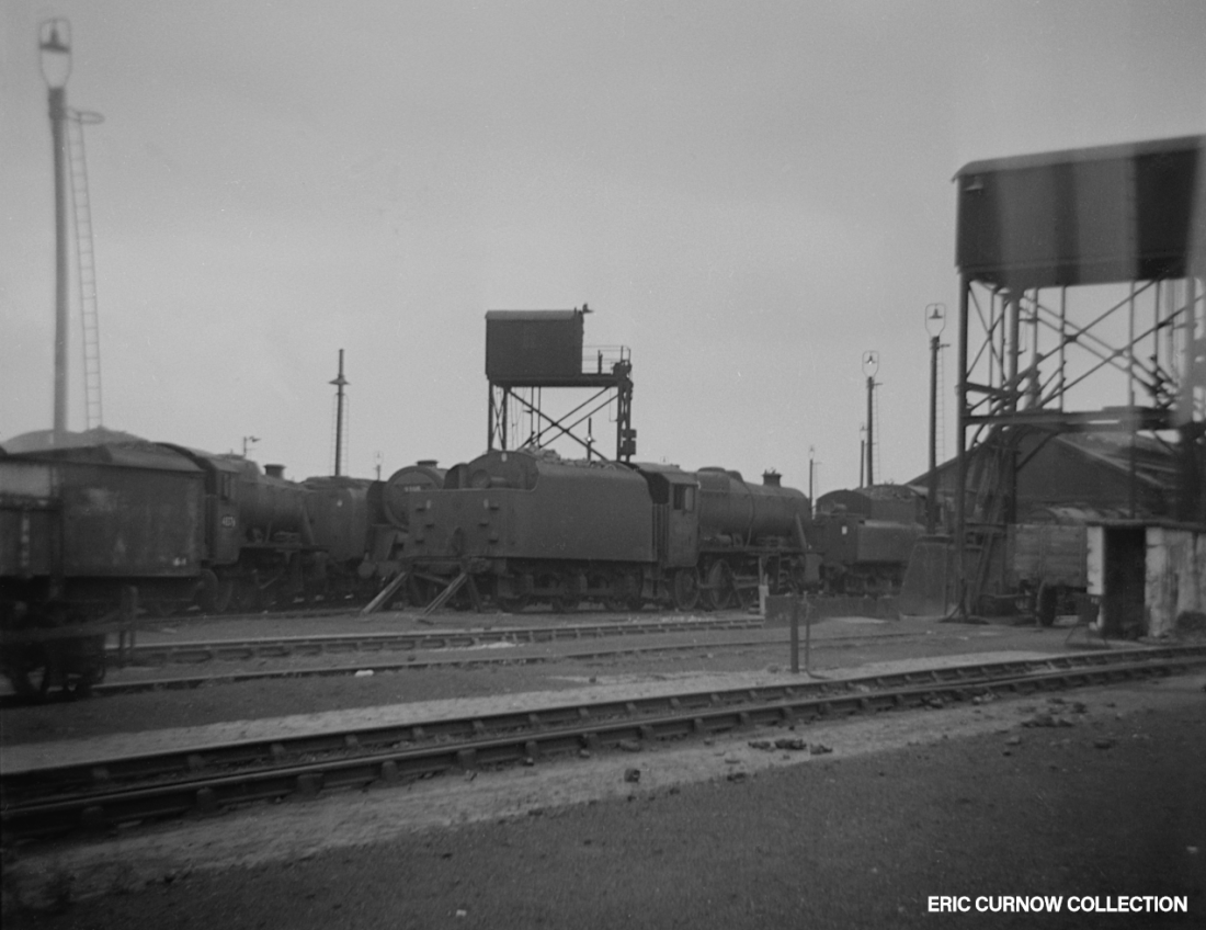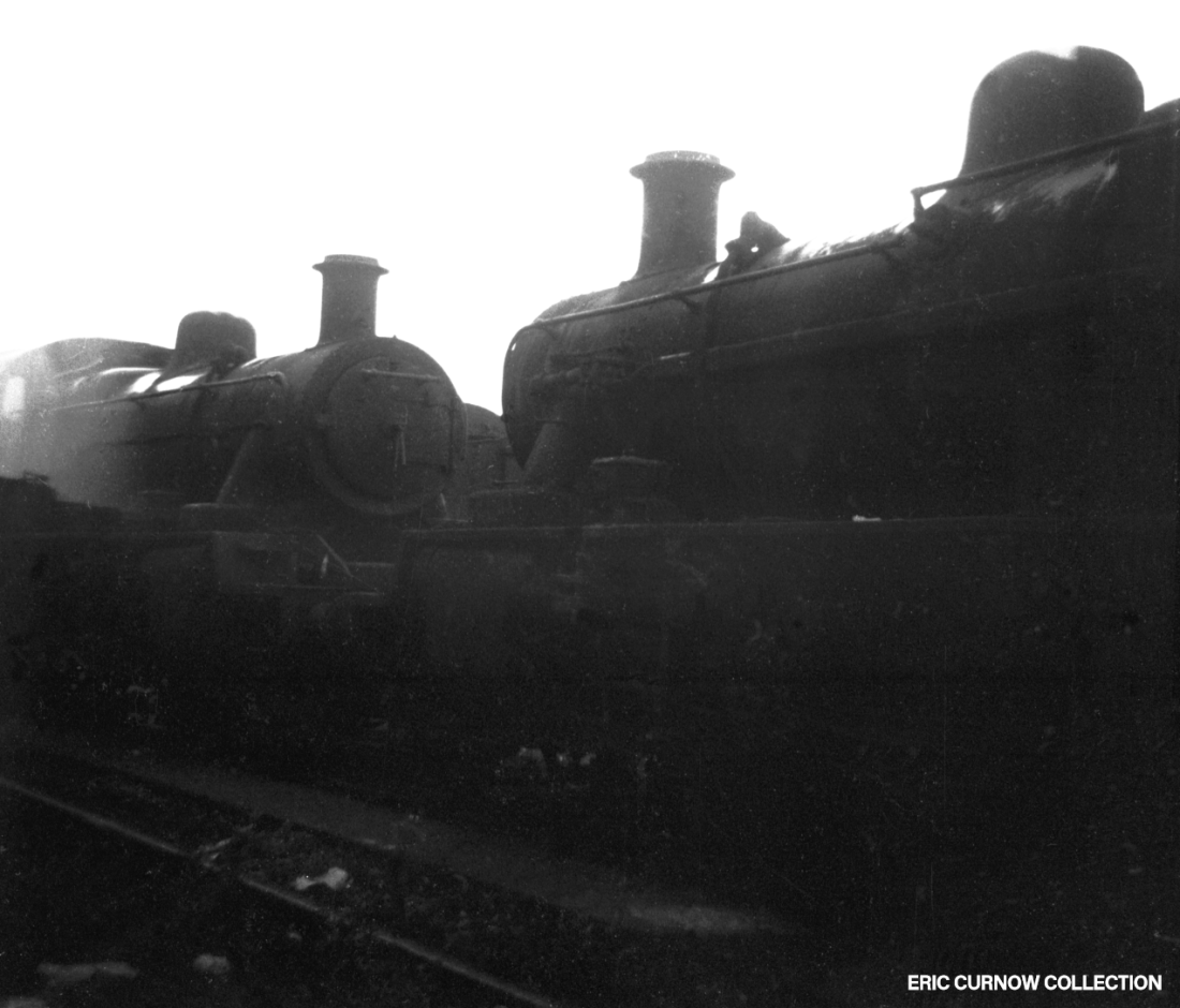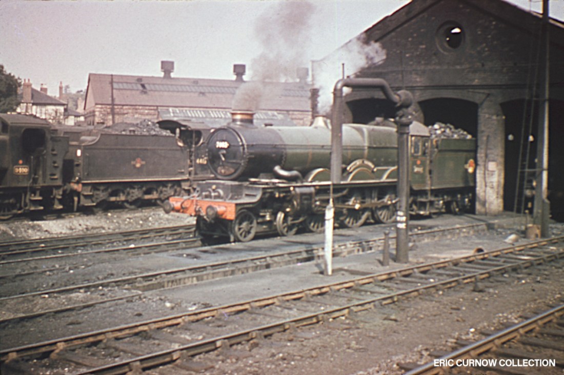 Smoke and steam rise from a ‘Castle’ in fine external condition – possibly 7023 – parked outside one of the sheds at Worcester, with 0-6-0s 9400 and an LMS ‘4F’ behind. I never went to Worcester until recent years, and found it a “pale shadow” of what it had once been. Tenders are piled high with coal, and a water crane and inspection pit are in the foreground. 6####IL01-WOR-s7023-PARKD