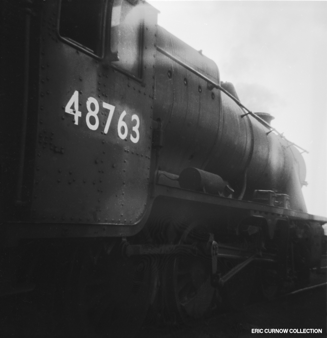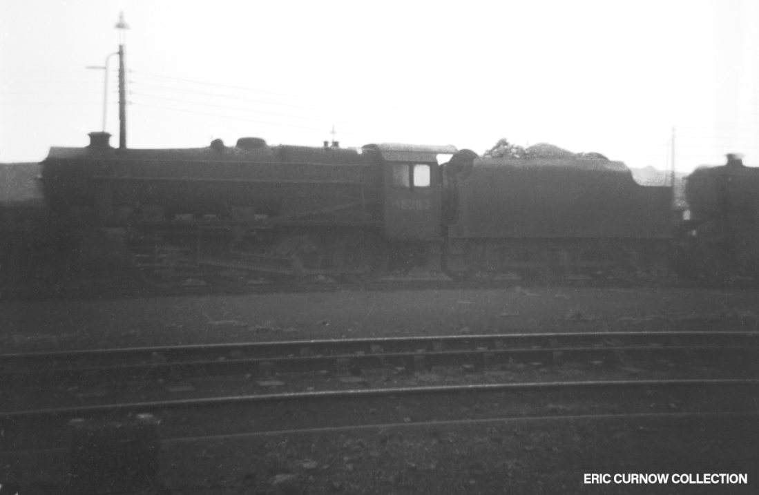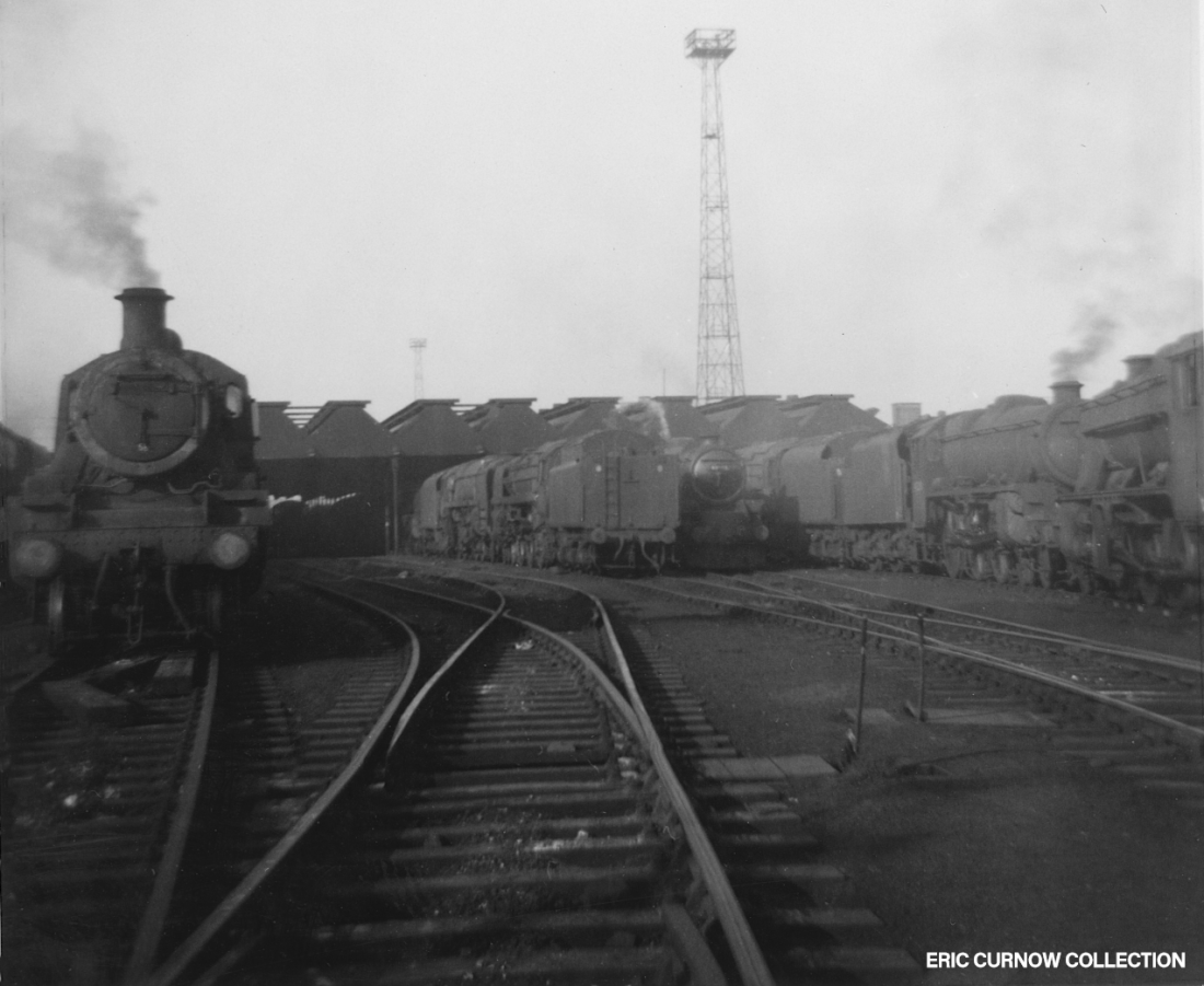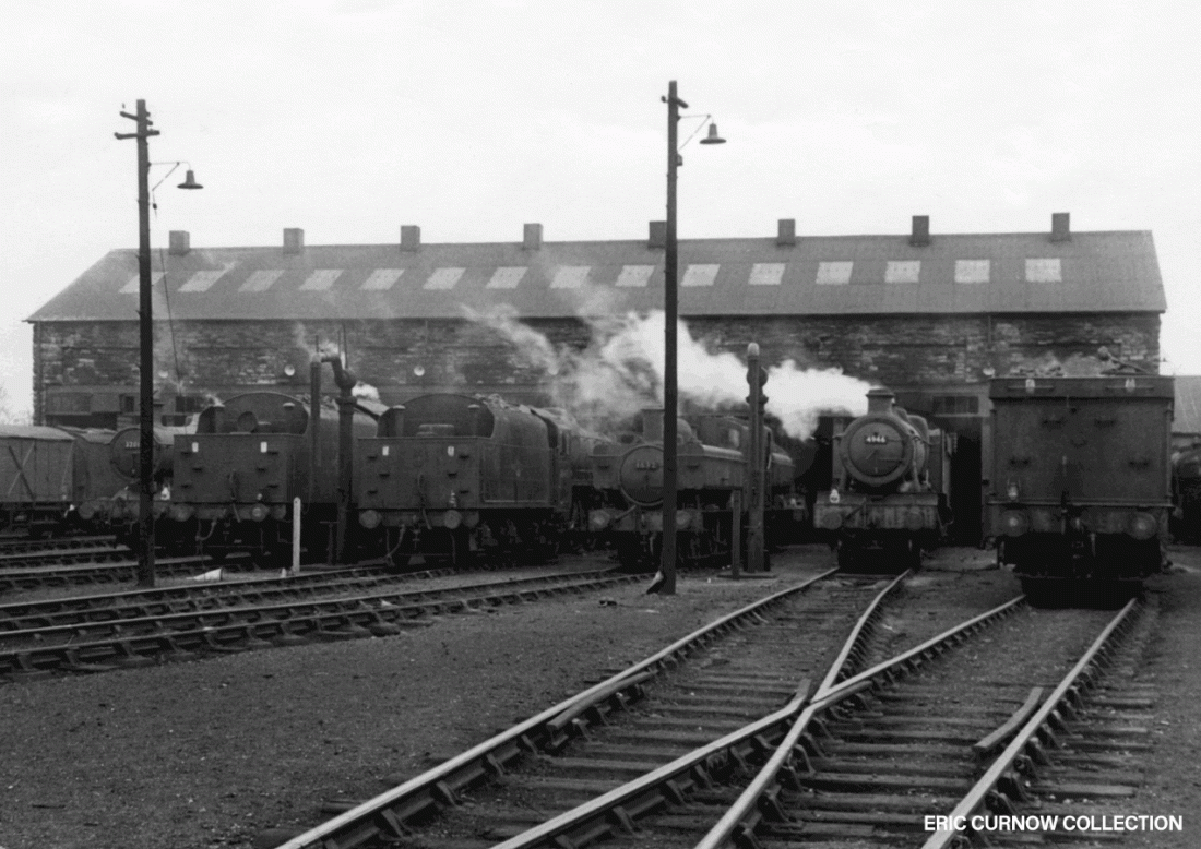 Smoke and steam rise from a ‘Castle’ in fine external condition – possibly 7023 – parked outside one of the sheds at Worcester, with 0-6-0s 9400 and an LMS ‘4F’ behind. I never went to Worcester until recent years, and found it a “pale shadow” of what it had once been. Tenders are piled high with coal, and a water crane and inspection pit are in the foreground. 6####IL01-WOR-s7023-PARKD