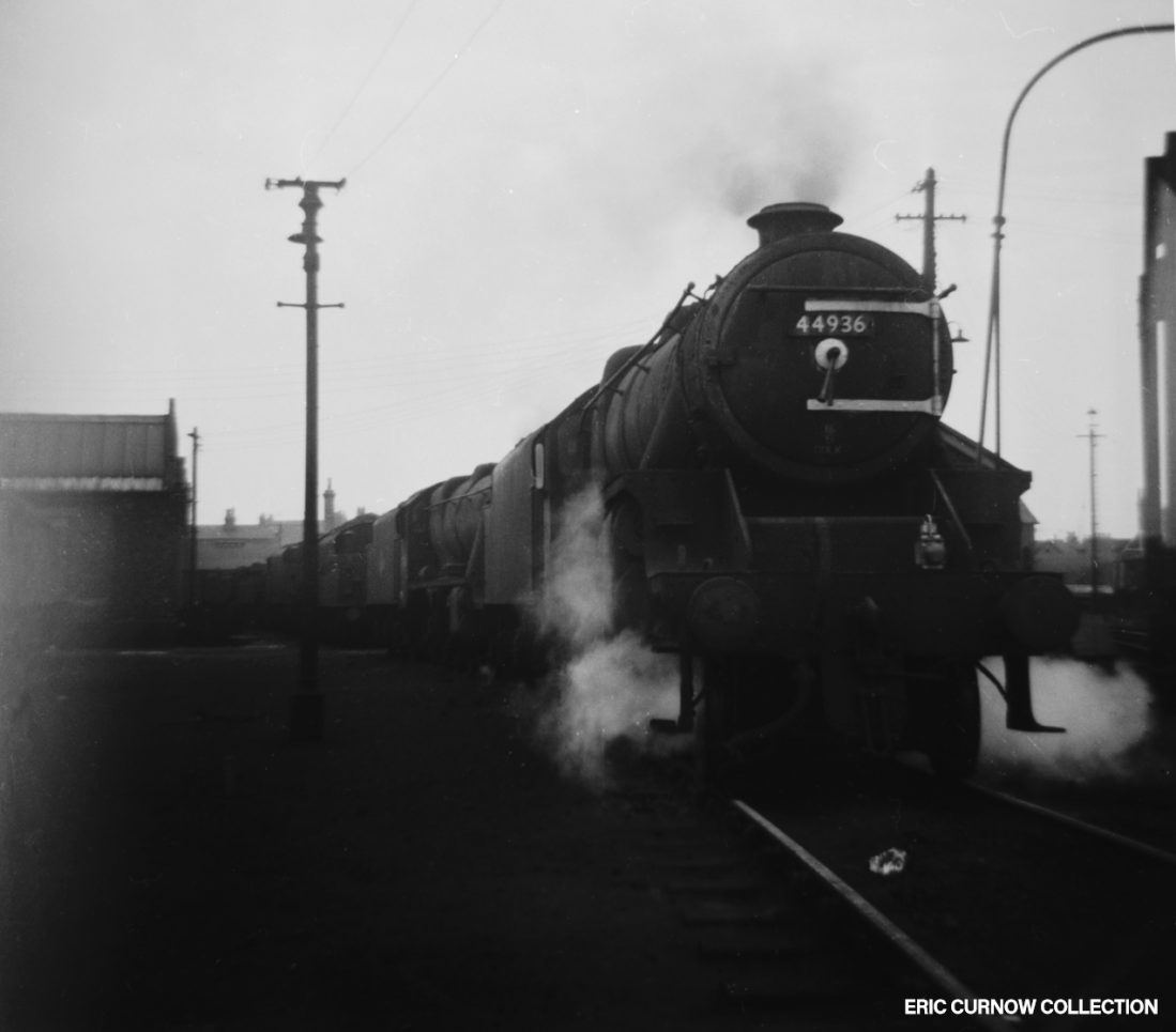 On a grey winter’s day Hereford depot hosts GWR and LMS locomotives. Included among the line-up are 3201, 1632, 4946 and what look like a couple of ‘Jubilees’. Breakdown vans are to the far left, and water columns separate each pair of tracks. The building and yard seem to be kept in very good repair. 551023A01-HFD-E_SHD-VISTA