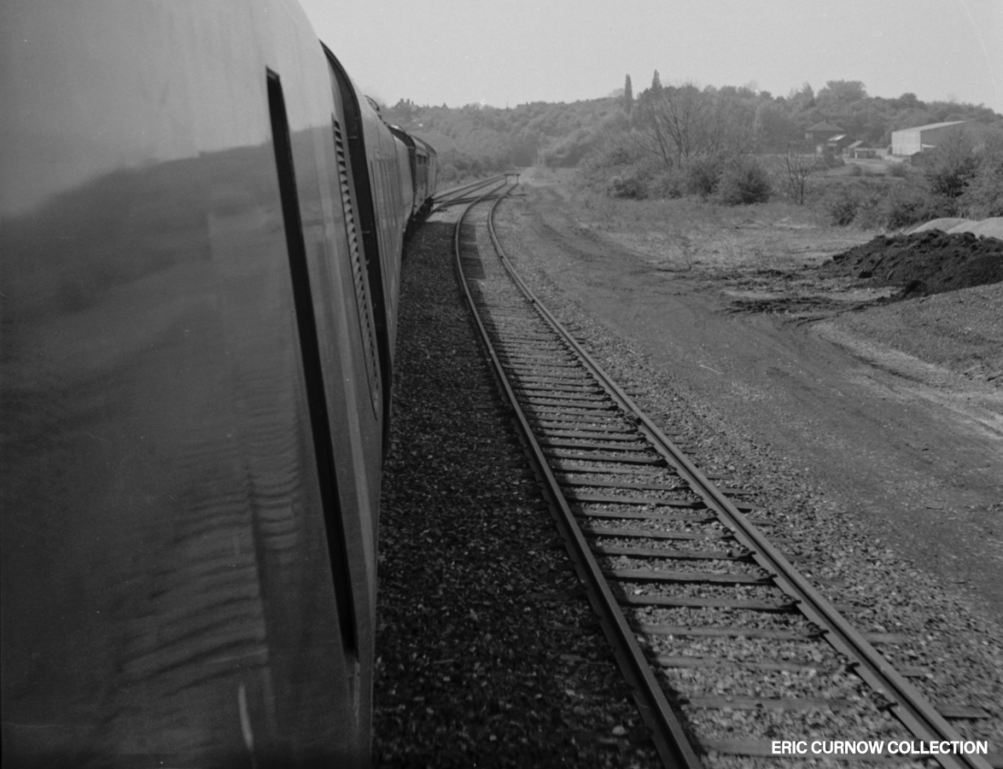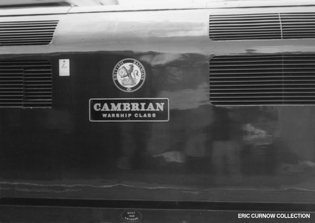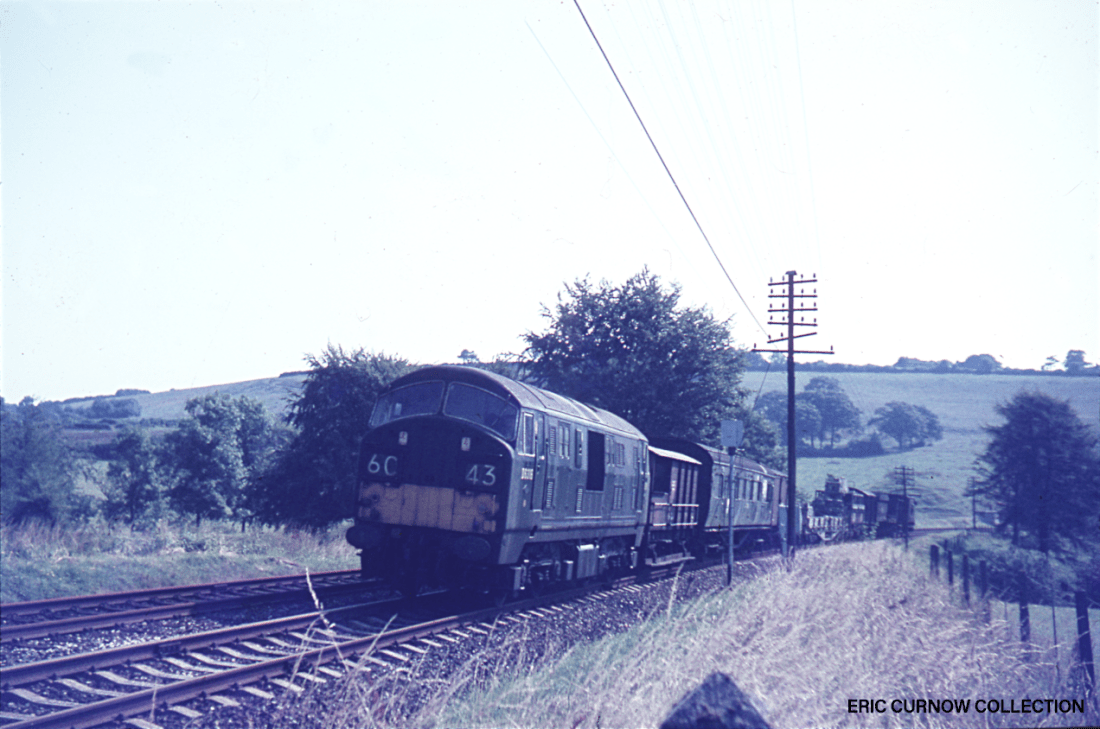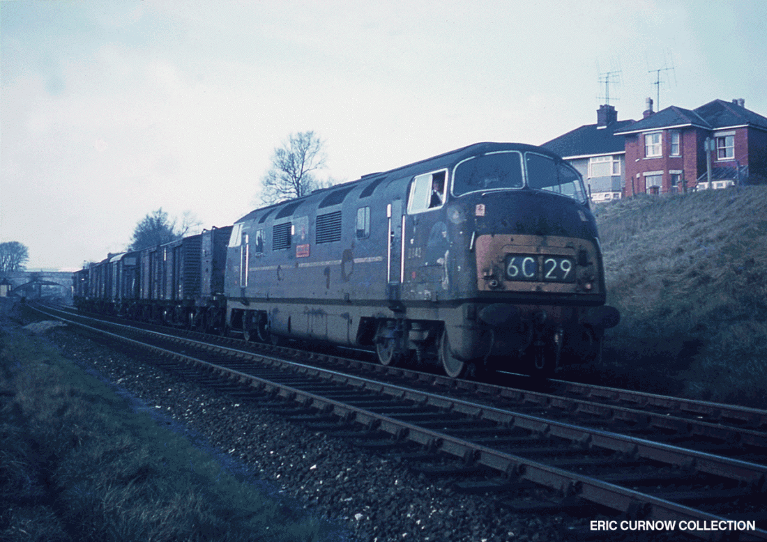 The first of its class – D6300 – is between Bristol and Bath at Keynsham on a running-in turn, at 10:50am, heading back to Swindon, on a service that is soon to be taken over by DMUs. The station platform is being renovated, but it still has a GWR running-in board. 590107A01-KYN-D6300-TES_T