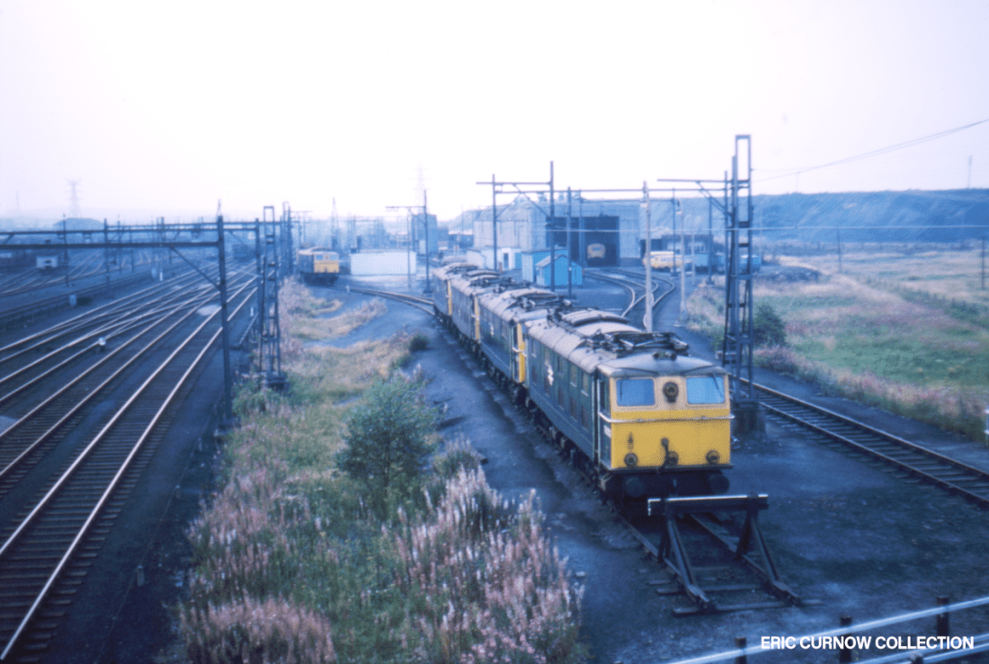 With pantographs lowered, Class 76 electric locos are pictured from an overbridge next to Wath depot in a sight I first saw in a railway book, and hoped one day to see in person (though the opportunity never presented itself). The engines seemed very basically styled to me, and devoid of elegance: which added to their allure and piqued my curiosity. 7210#AH01-WAH-76050-PARKD