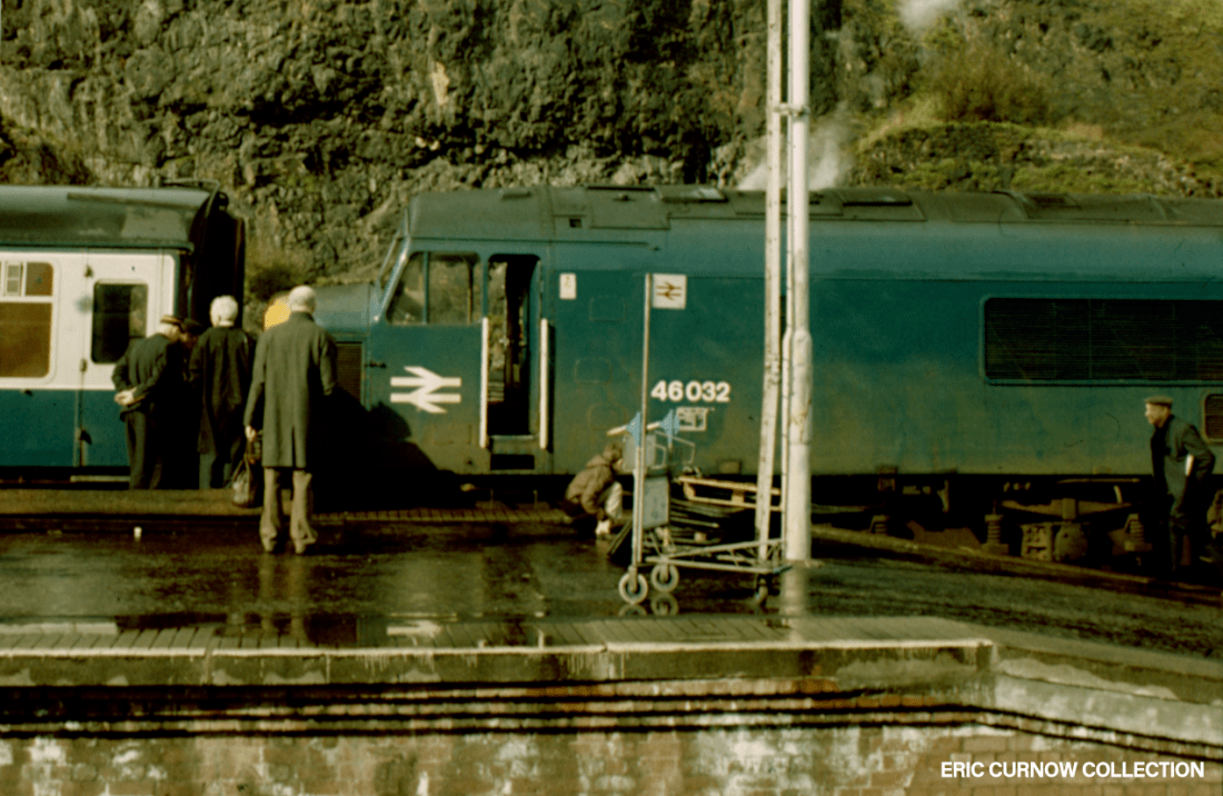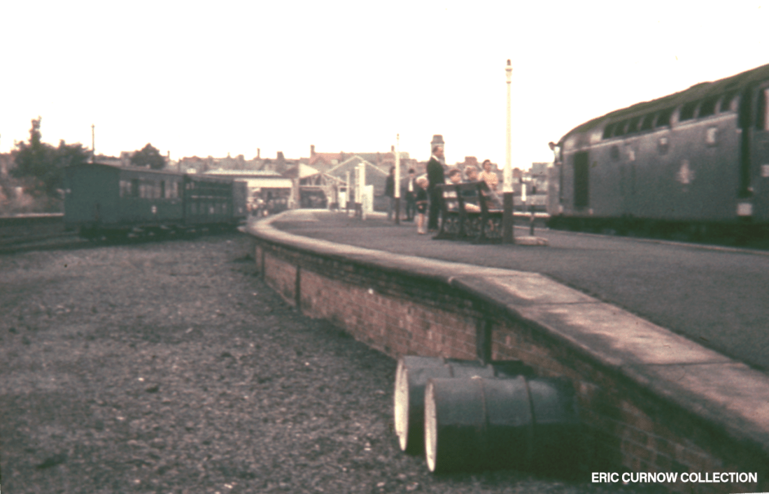 The gaze of platform passengers along with a driver of an unnamed Class 40 is taken by the loco’s reversal from the platforms of Aberyswyth station in the 1960s. To the left are carriages of the Vale of Rheidol railway in blue livery bearing the BR double-arrow logo, and an area between each sight where track has been lifted and the ballast smoothed-over. 7####GT03-AYW-CL_40-PAS_D