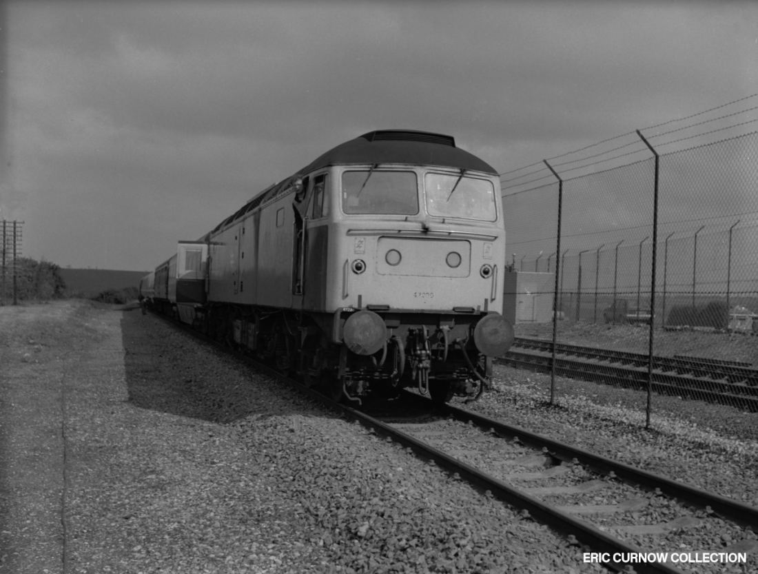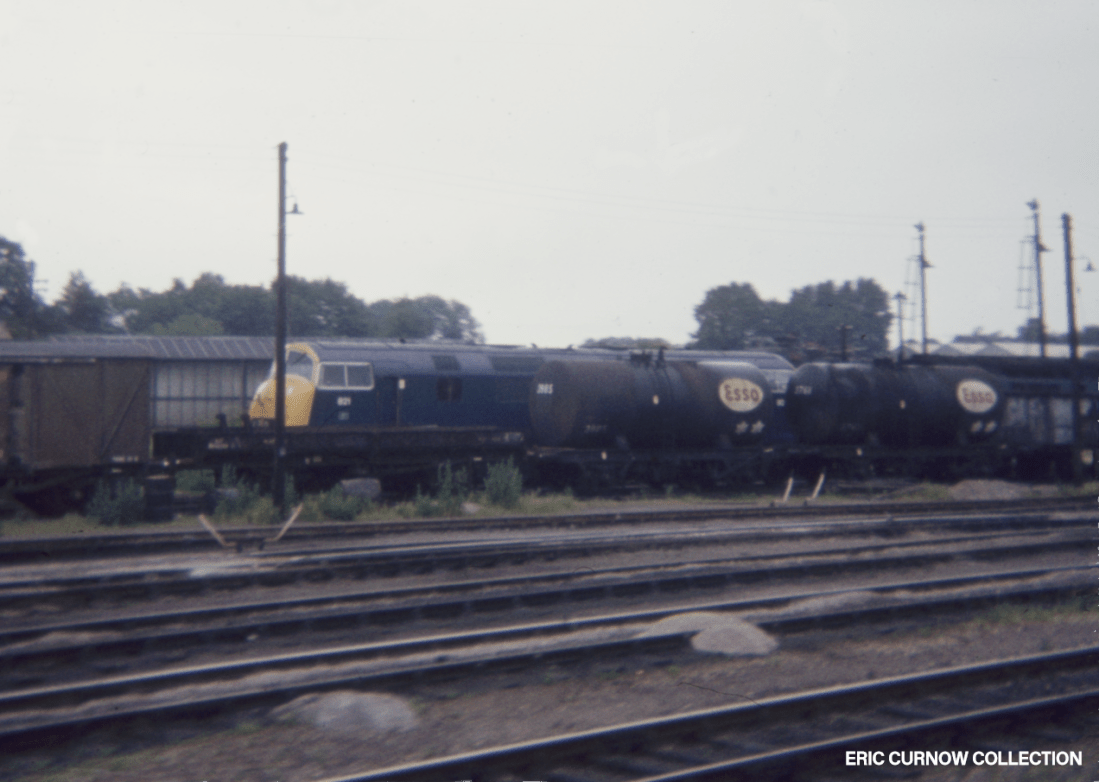 D821 “GREYHOUND”, which went on to preservation, is pictured in an unidentified location, parked amid rolling stock including oil tanks and a van, perhaps in Westbury yard, in the days before roller blinds wound up in the cab ends were dispensed with. A few spoil heaps of ballast have been accidently spilt around one of the foreground tracks. 6####IK01-UNK–D821-PARKD