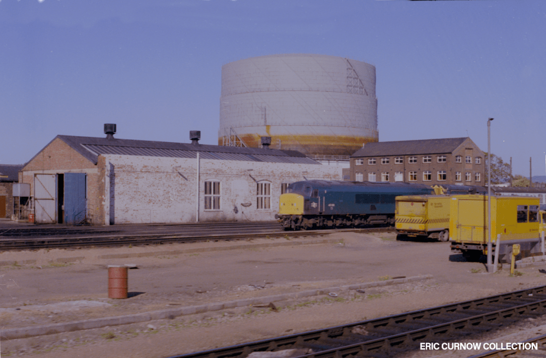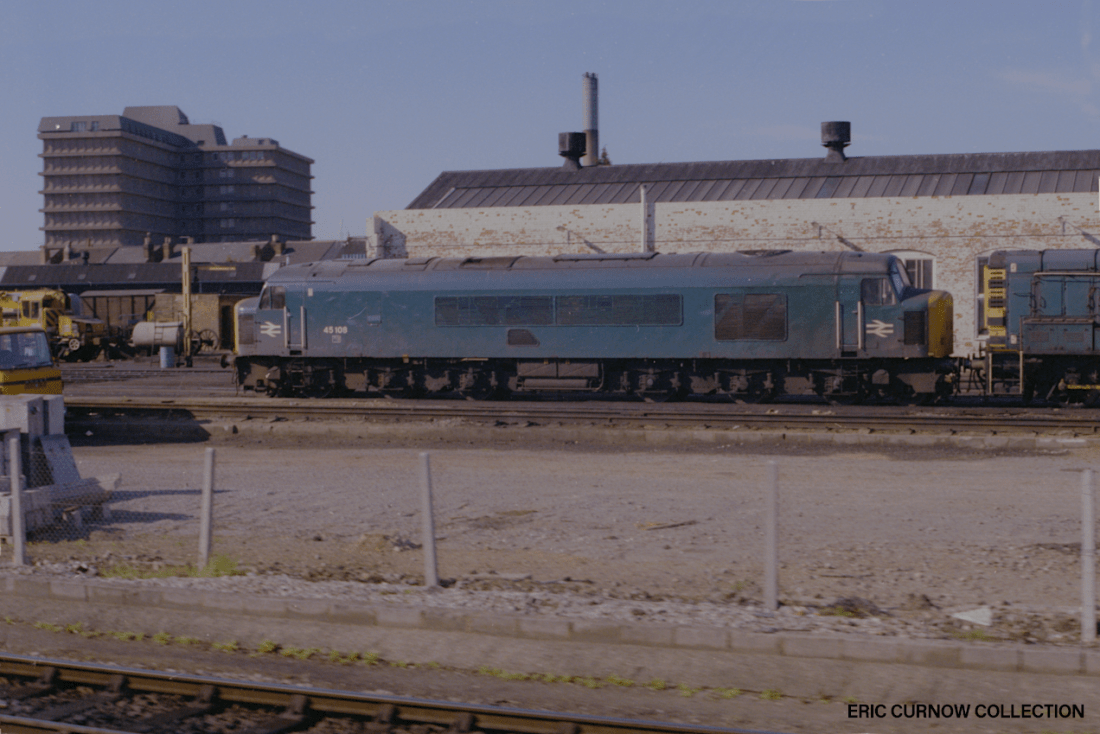 ‘Peak’ 45108 and an 08 shunter are parked up together on Gloucester Horton Road depot, that is at this time a “pale shadow” of it’s former size. The three ventilatored building is the only remains of the factory and running sheds assembly, and the white paintwork being the interior wall of one of the latter. This building and the gasometer were iconic throughout the diesel era. 7####HI01-GHR-45108-PARKD