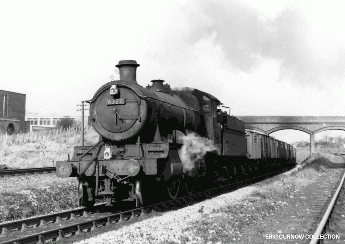 Oozing steam, ageing GWR 2-600 6327 climbs eastwards from the Severn and Patchway Tunnels towards Patchway station with a “through freight, not fitted with automatic brakes”, as signified by the headcode lights. Although the trucks look empty, coming from South Wales they are presumably filled with coal. 5####AU01-PWY-s6327-GOODS
