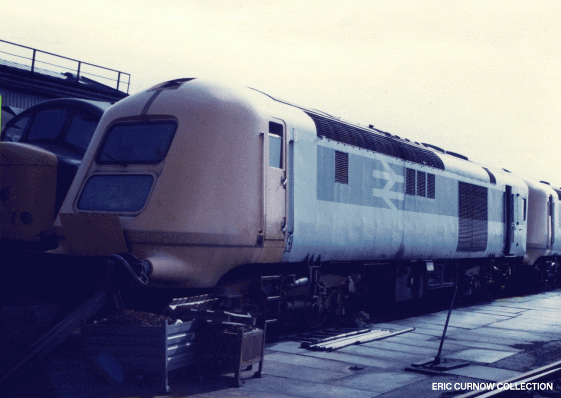 The two power cars of the prototype High Speed Train (HST) set are parked together nose to tail at BREL Derby Works – next to a ‘Peak’ Class locomotive. The paintwork has got partially bleached by the sun, and a painted stripe has been added above the windscreen. #####BG01-UNK-41~01-SCRAP